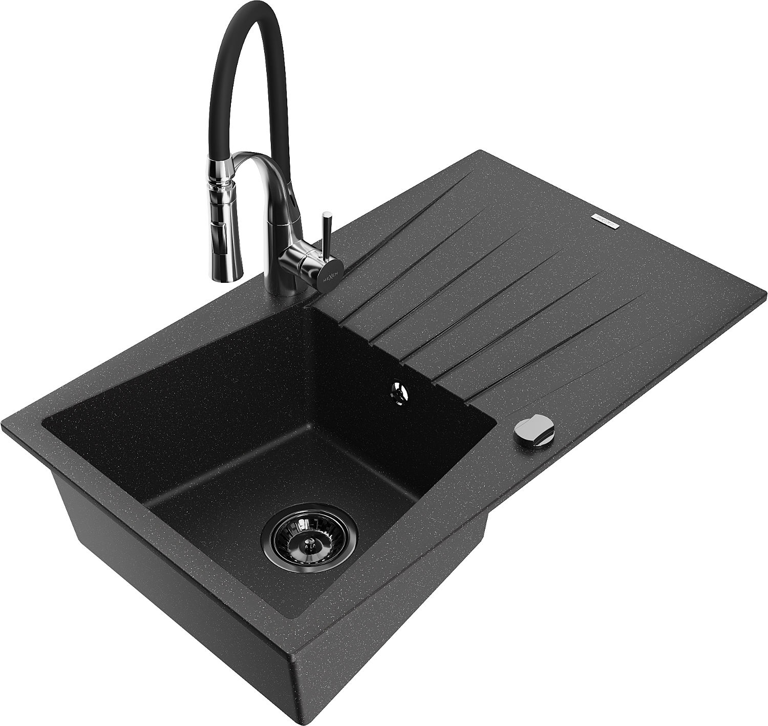 Mexen Cesar évier en granit 1 bac avec égouttoir et robinet de cuisine Aster, noir/argent métallique - 6514-73-73450-07-B