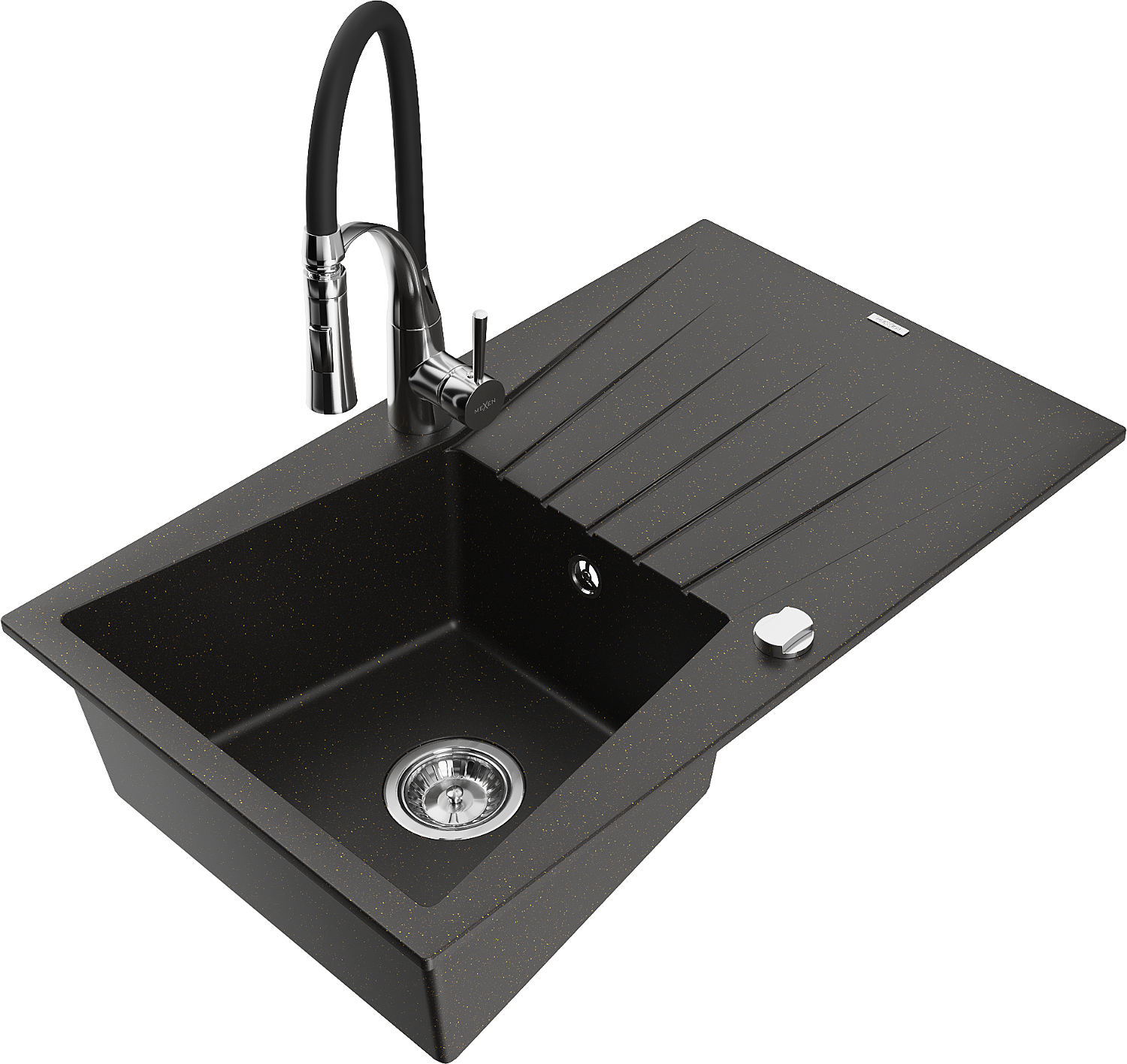 Mexen Cesar évier en granit 1 bac avec égouttoir et robinet de cuisine Aster, noir/métal doré - 6514-75-73450-07