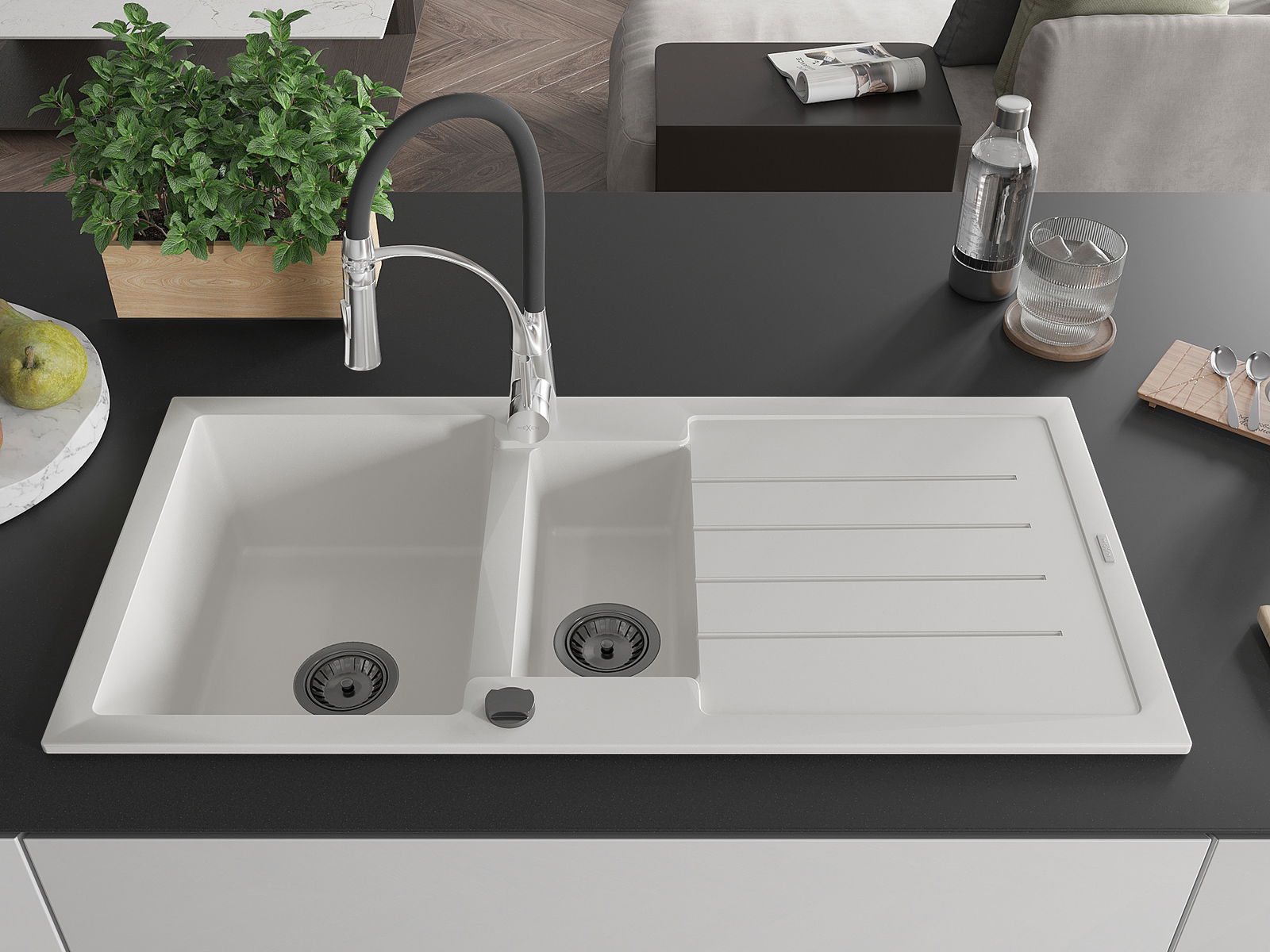 Mexen Andres évier en granit 1,5 bac avec égouttoir et robinet de cuisine Aster, blanc - 6515-20-73450-07-B