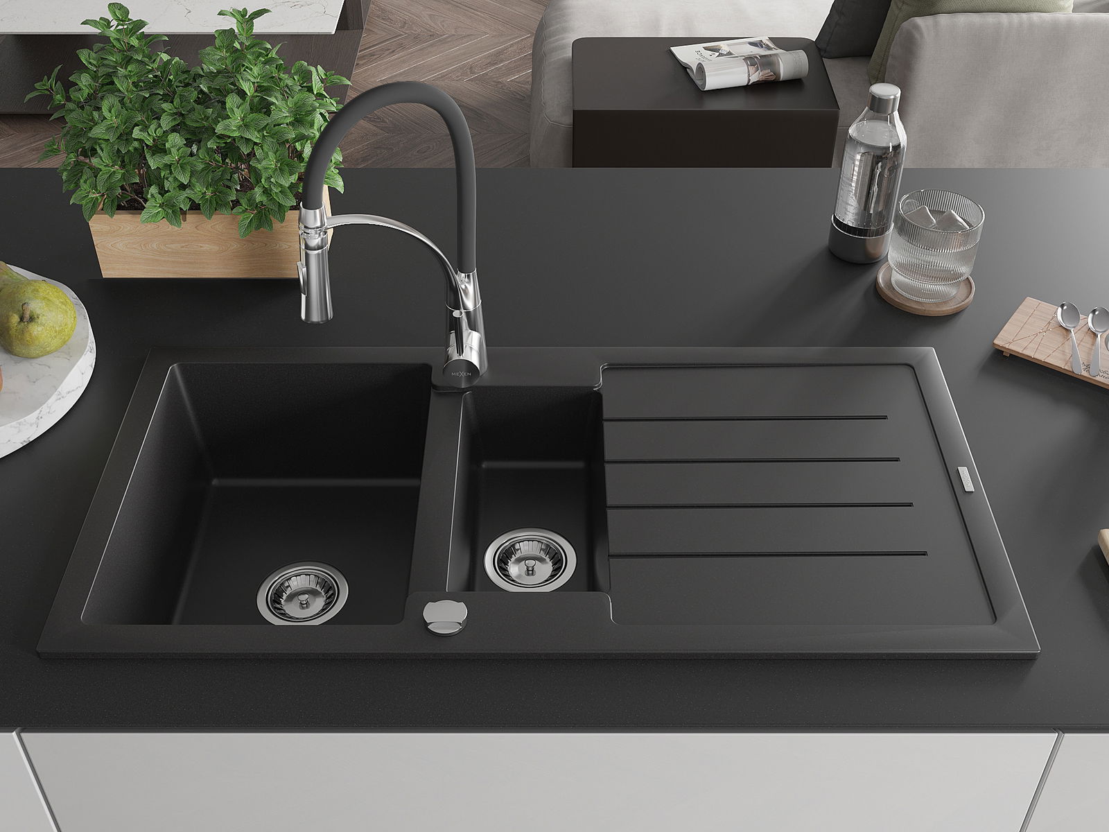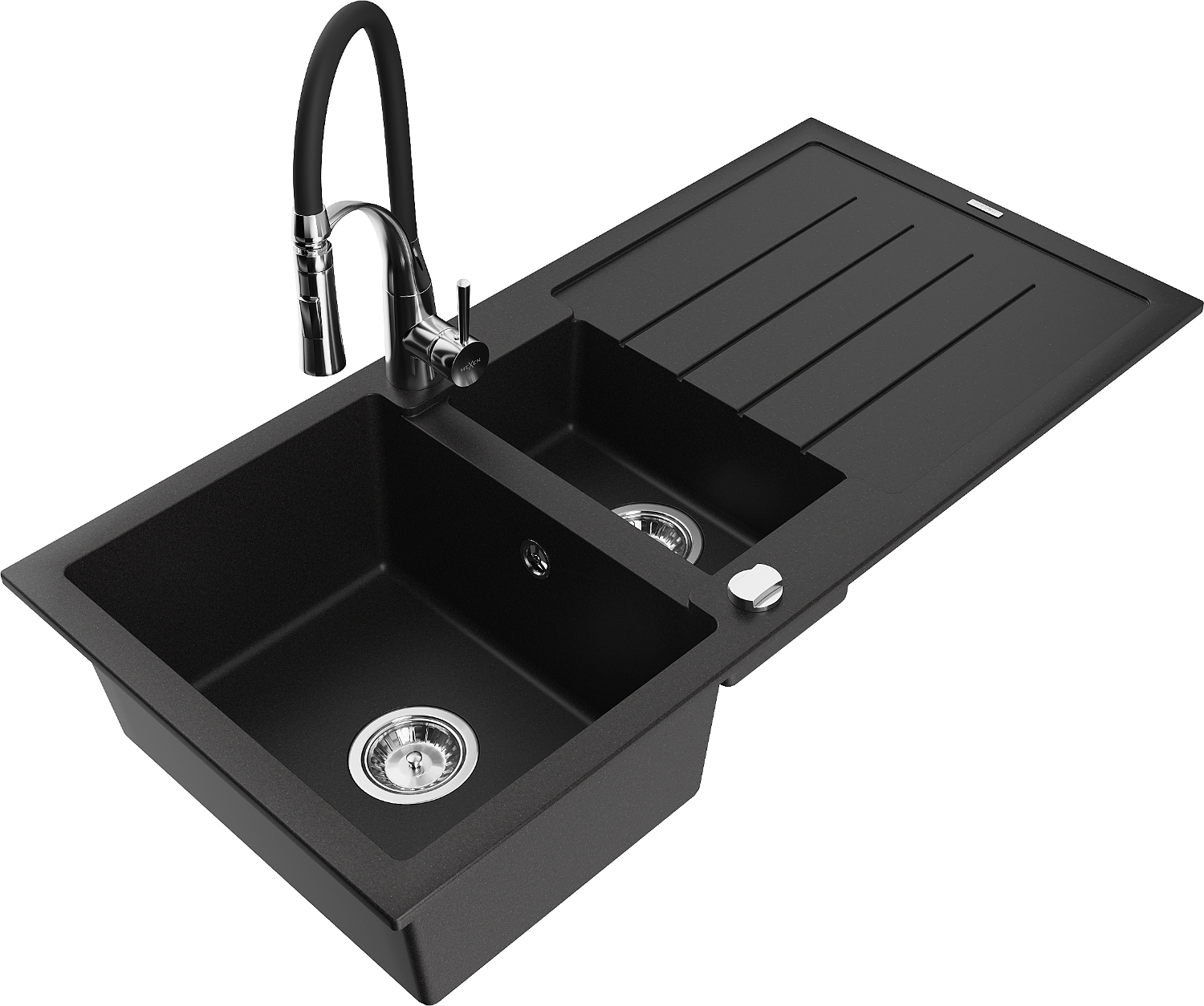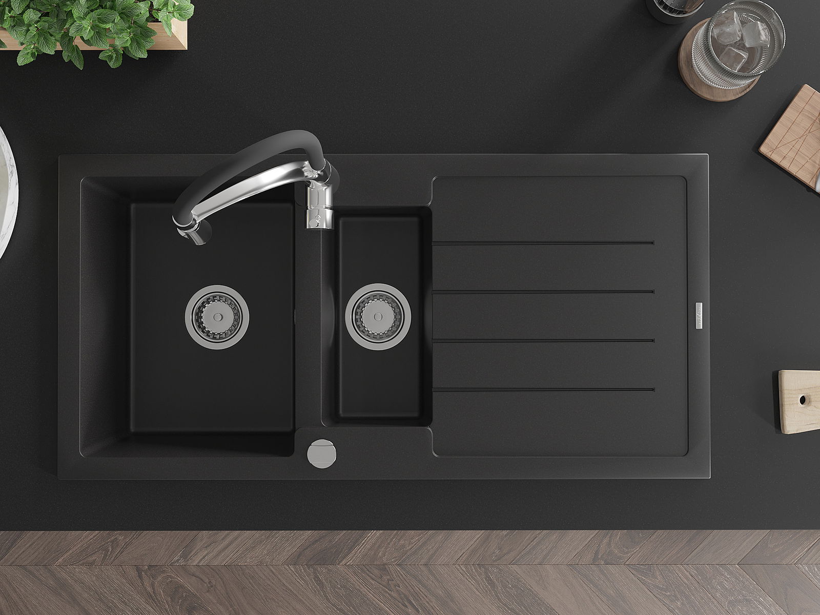 Mexen Andres évier en granit 1,5 bac avec égouttoir et robinet de cuisine Aster, noir - 6515-77-73450-07