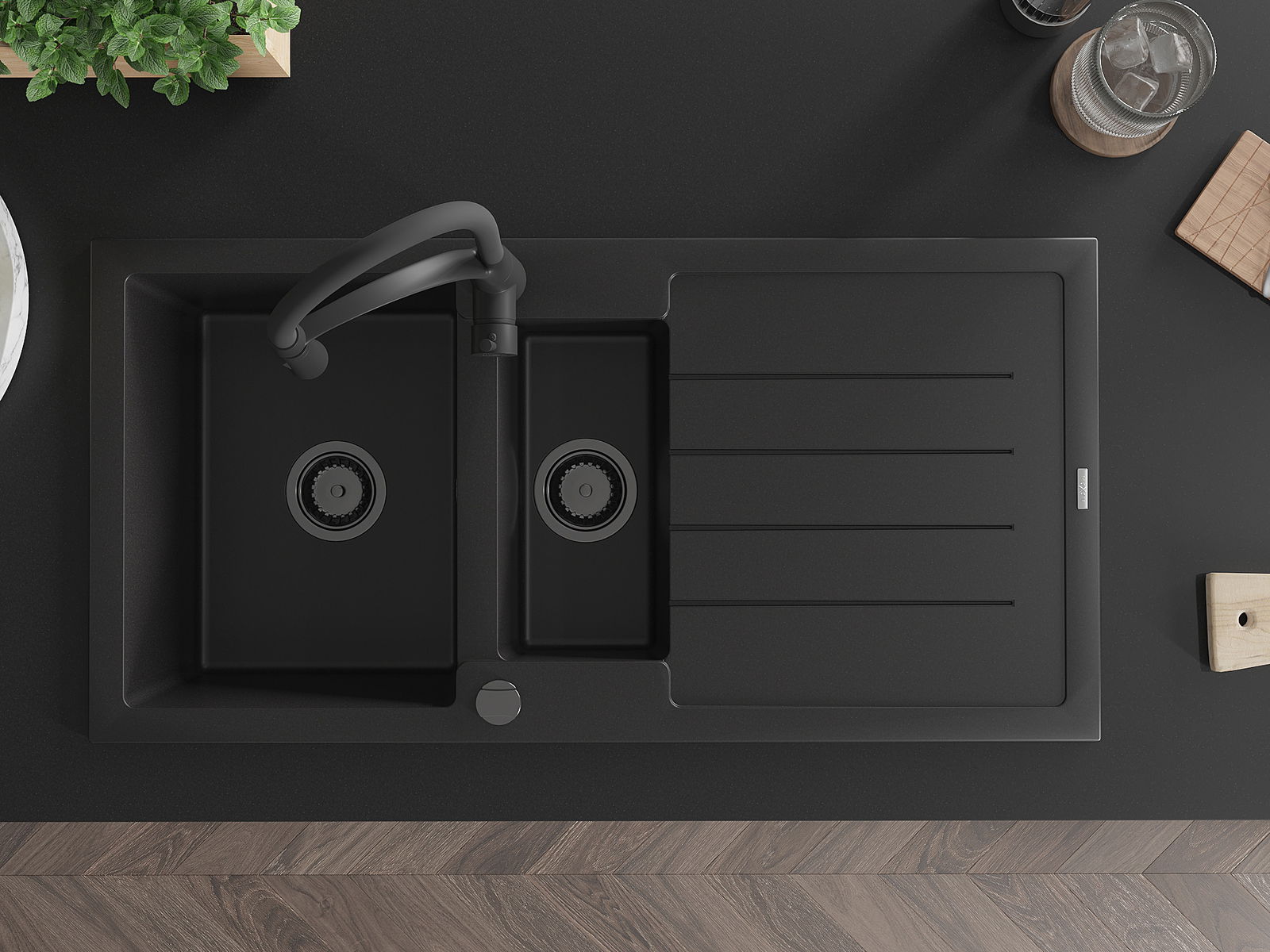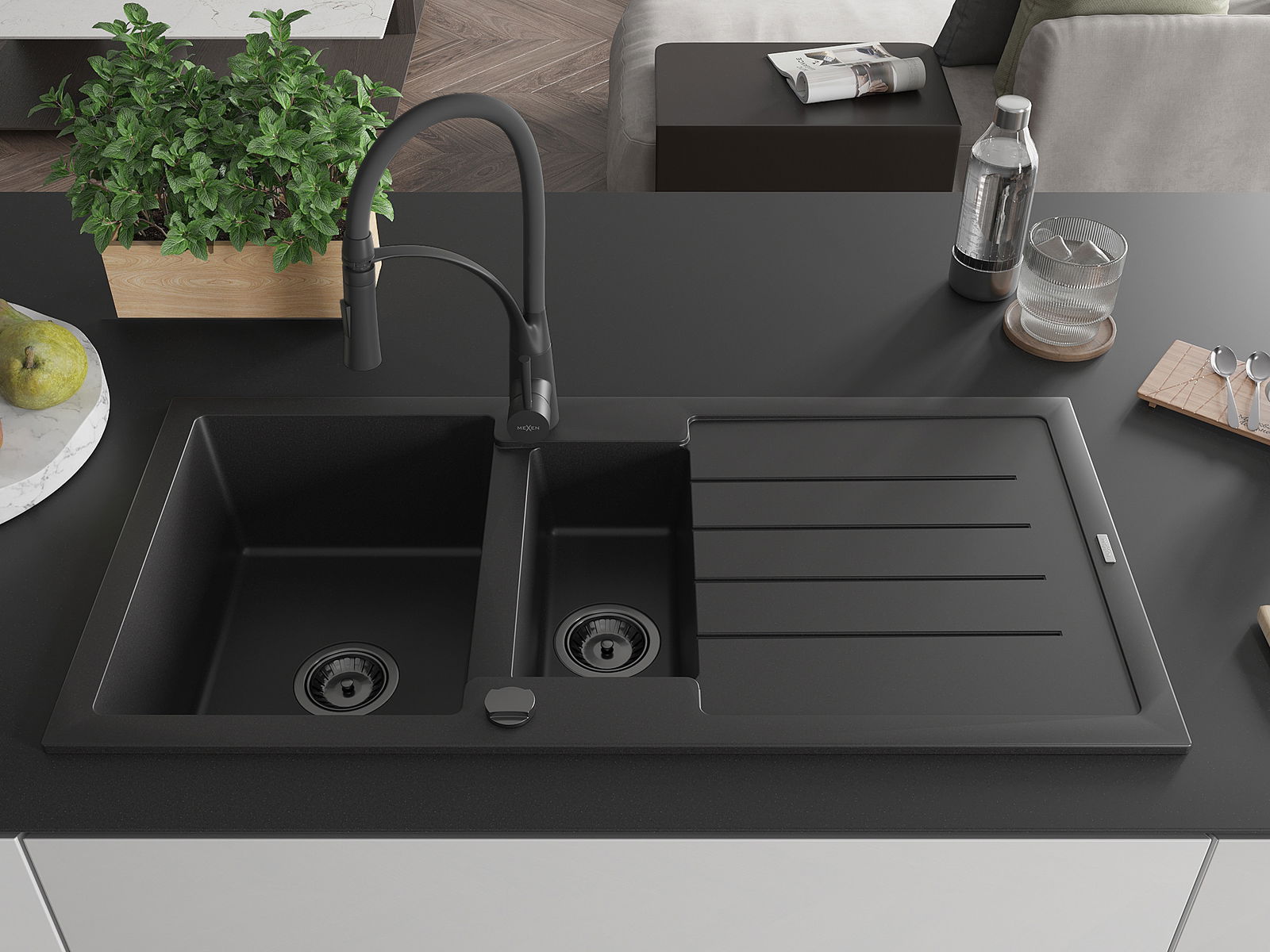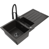 Mexen Andres évier en granit 1,5 bac avec égouttoir et robinet de cuisine Aster, noir - 6515-77-73450-70-B