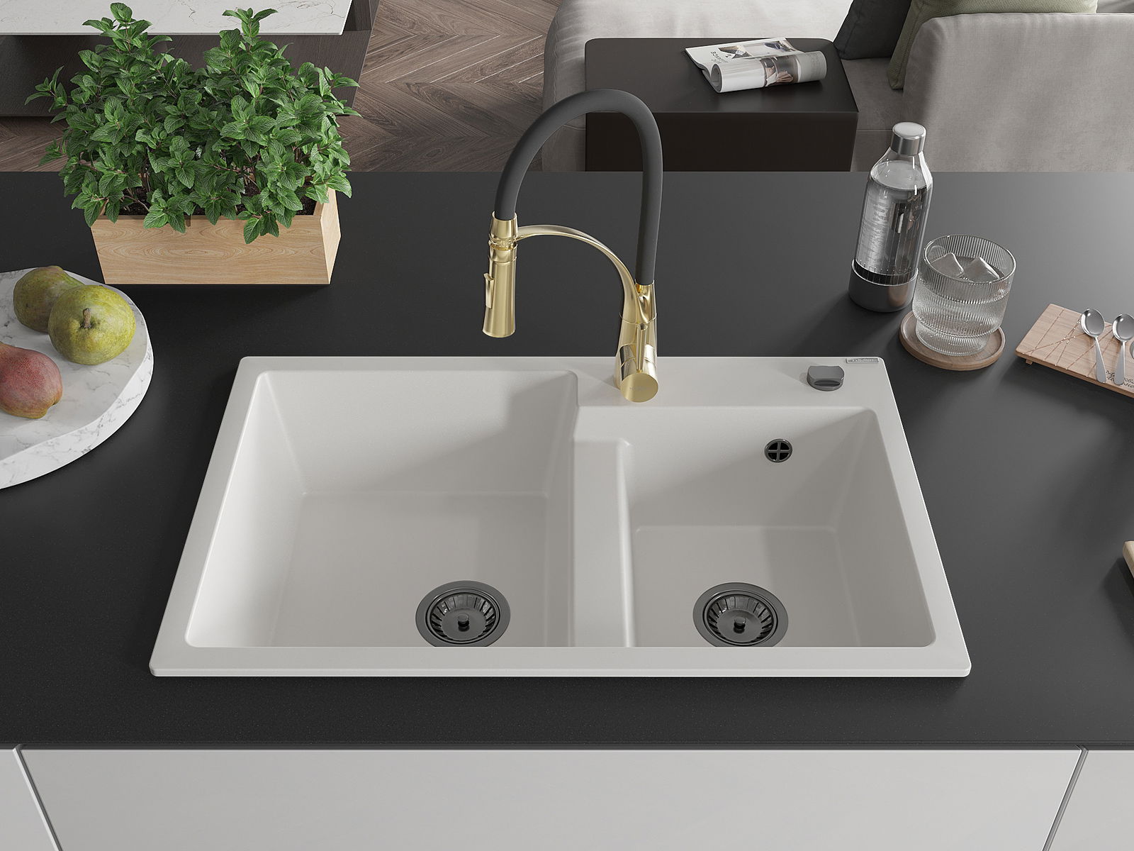 L'évier a un trou sous-meulé de 35 mm de diamètre à percer soi-même. Il peut être utilisé, entre autres, pour installer un distributeur de liquide, ce qui éliminera la présence de bouteilles en plastique dans la cuisine et lui donnera une finition élégante.