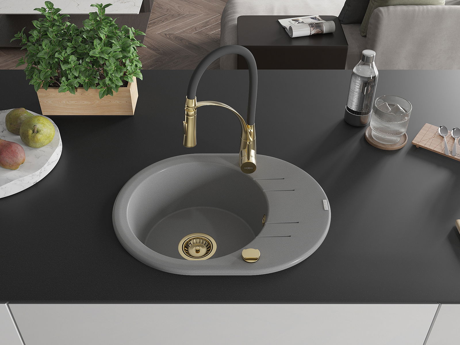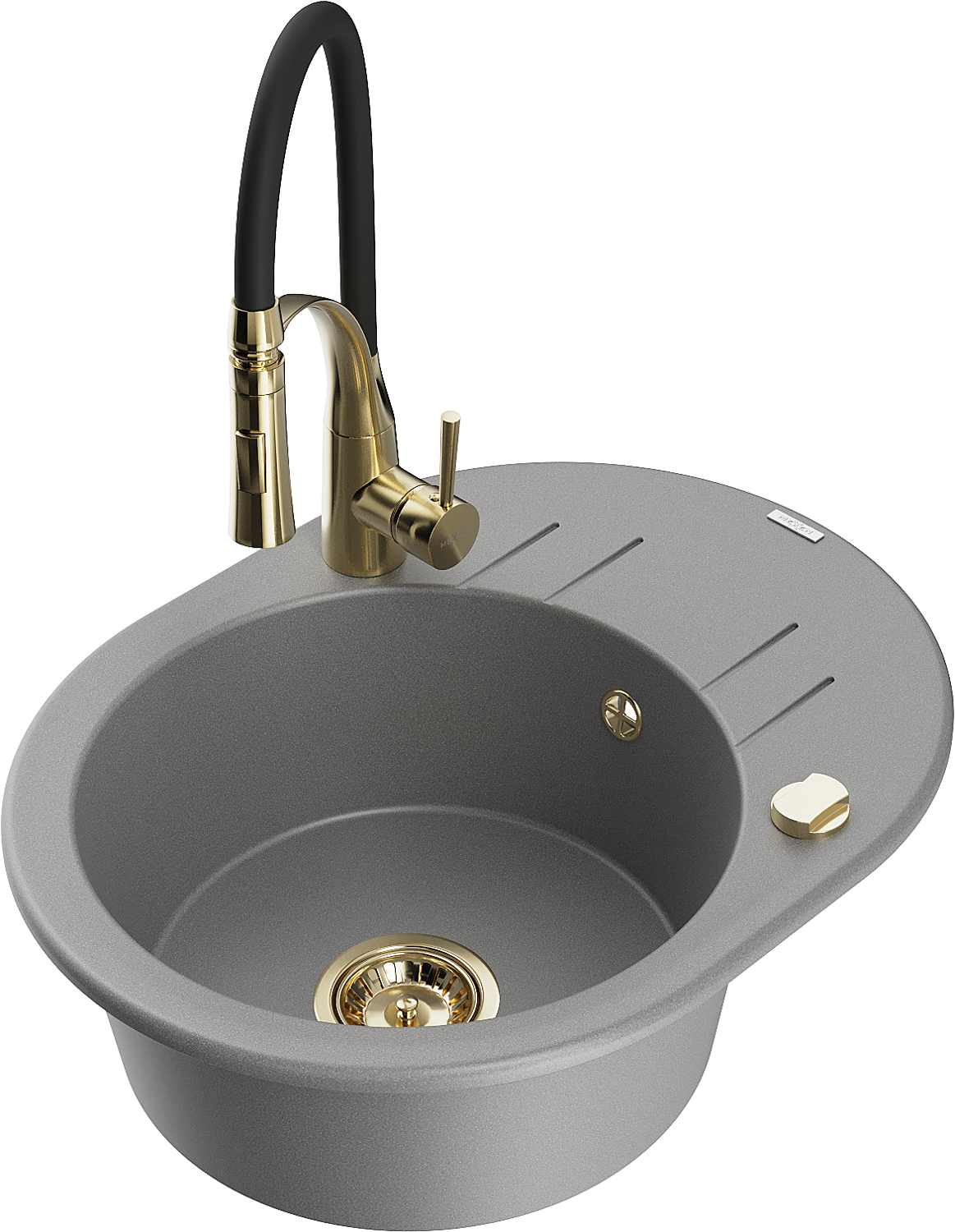 Mexen Kevin évier en granit 1 bac avec égouttoir et robinet de cuisine Aster, gris - 6517-71-73450-57-G
