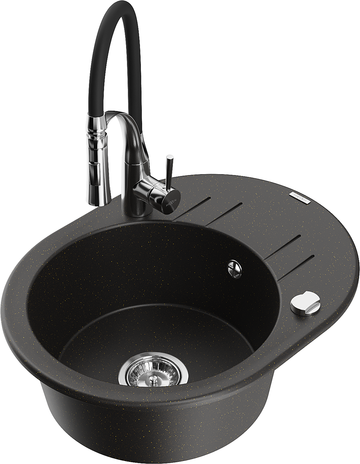 Mexen Kevin évier en granit 1 bac avec égouttoir et robinet de cuisine Aster, noir/doré métallisé - 6517-75-73450-07
