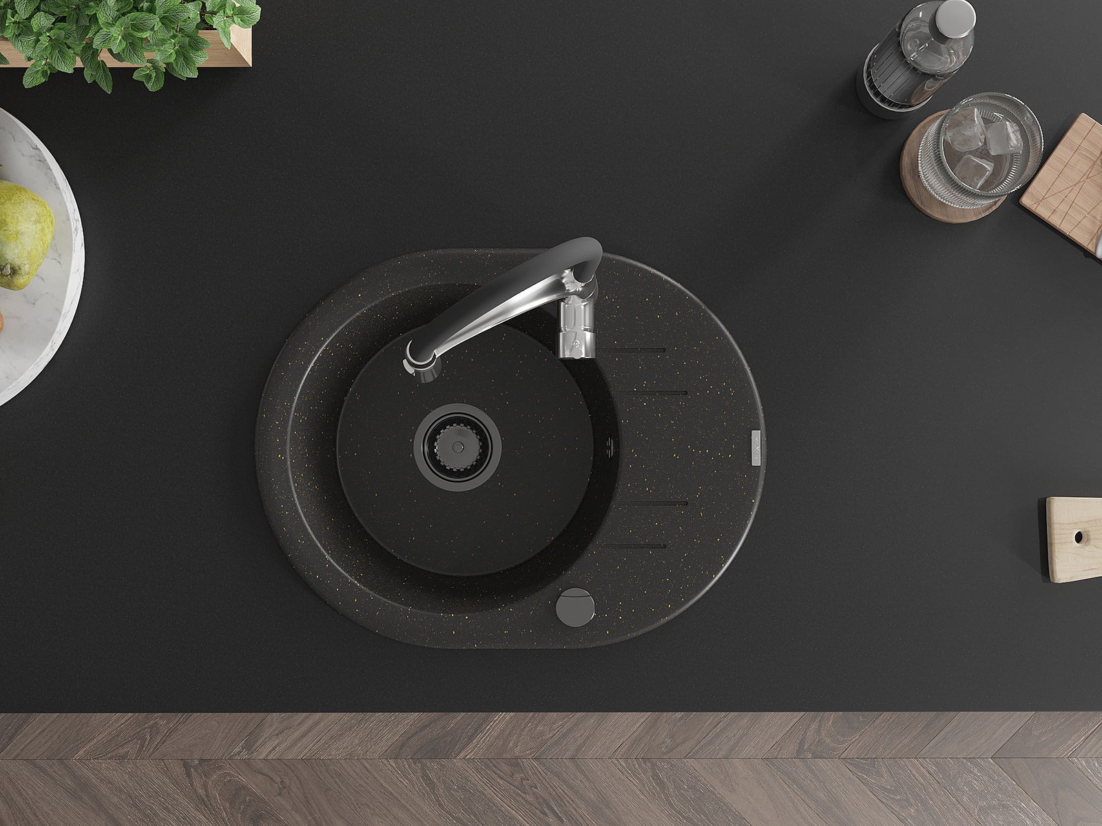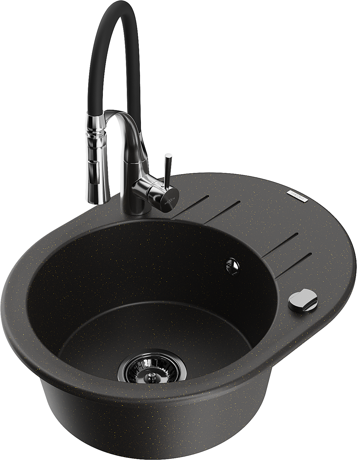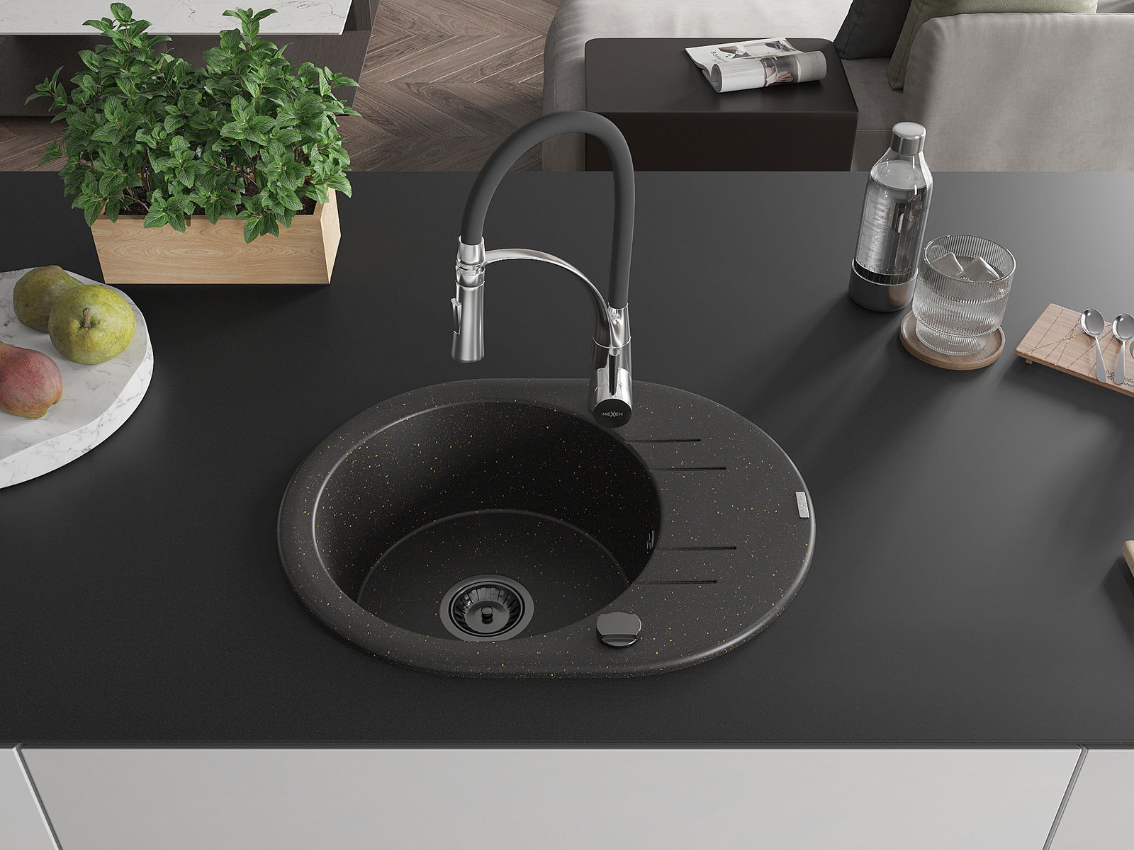 Mexen Kevin évier en granit 1 bac avec égouttoir et robinet de cuisine Aster, noir/doré métallique - 6517-75-73450-07-B
