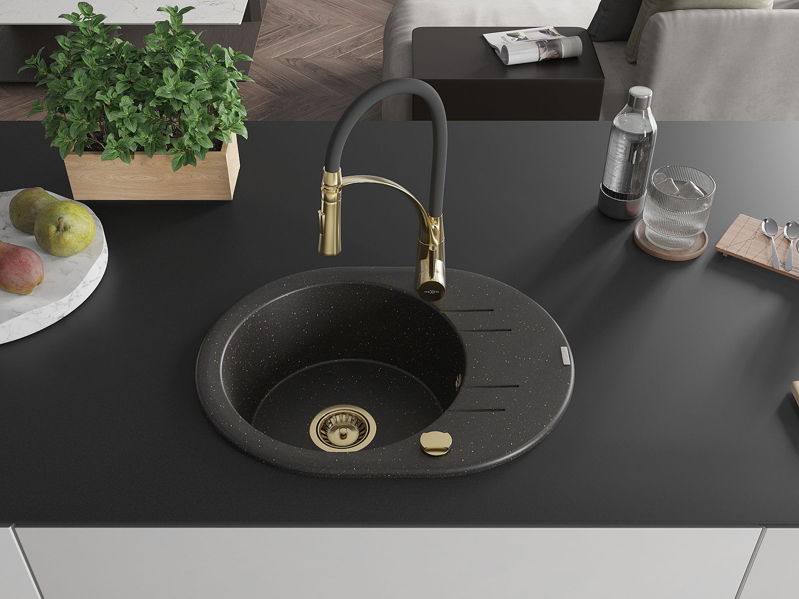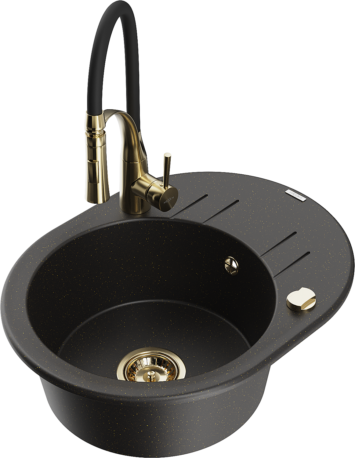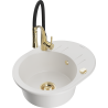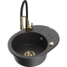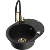 Mexen Kevin évier en granit 1 bac avec égouttoir et robinet de cuisine Aster, noir/or métallique - 6517-75-73450-57-G