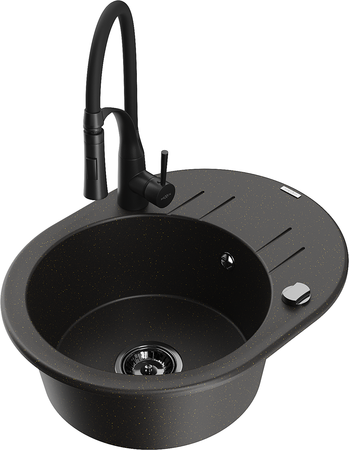 Mexen Kevin évier en granit 1 bac avec égouttoir et robinet de cuisine Aster, noir/or métallisé - 6517-75-73450-70-B