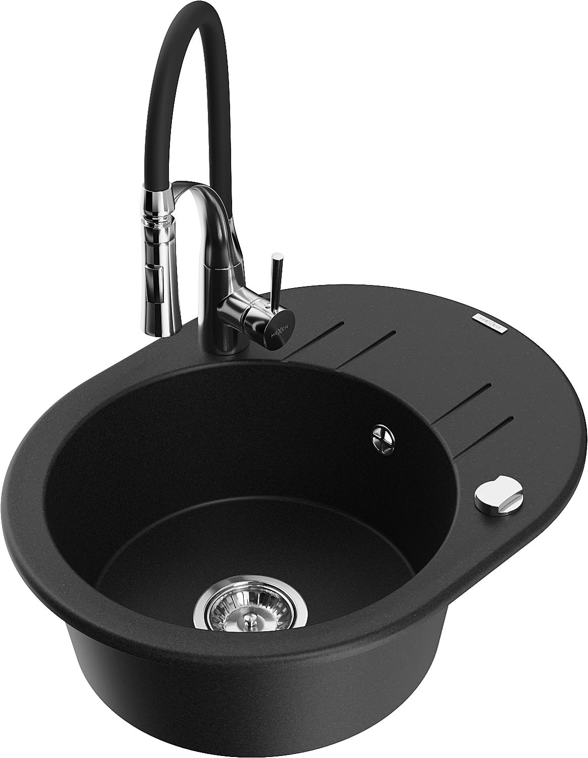 Mexen Kevin évier en granit à 1 bac avec égouttoir et robinet de cuisine Aster, noir - 6517-77-73450-07