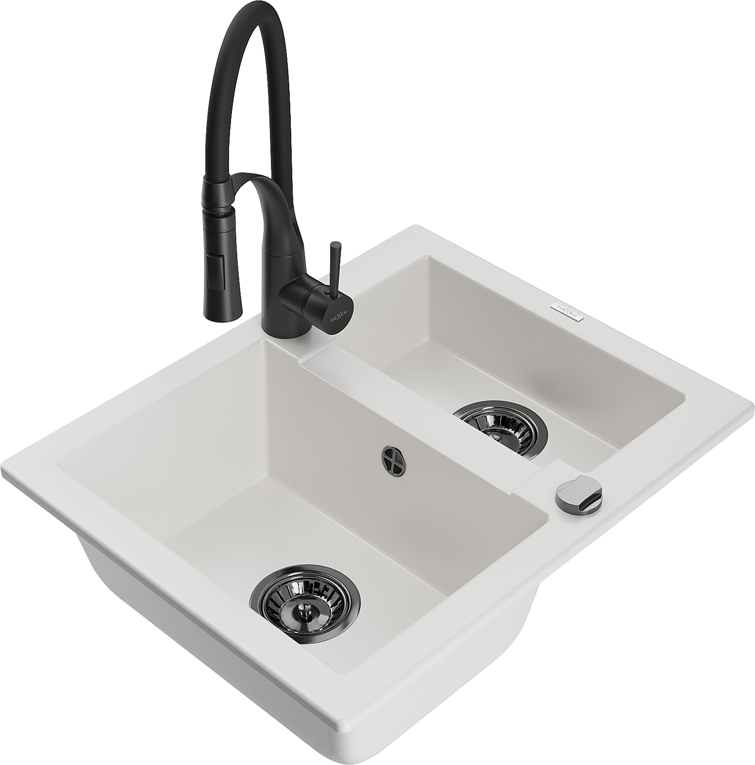 Mexen Carlos évier en granit 1,5 cuves avec robinet de cuisine Aster, blanc - 6518-20-73450-70-B