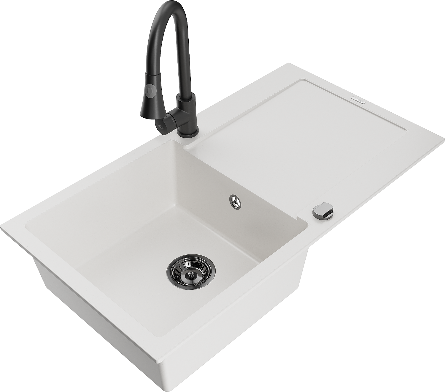 Mexen Leo évier en granit 1 bac avec égouttoir et robinet de cuisine Elia, blanc - 6501-20-670101-70