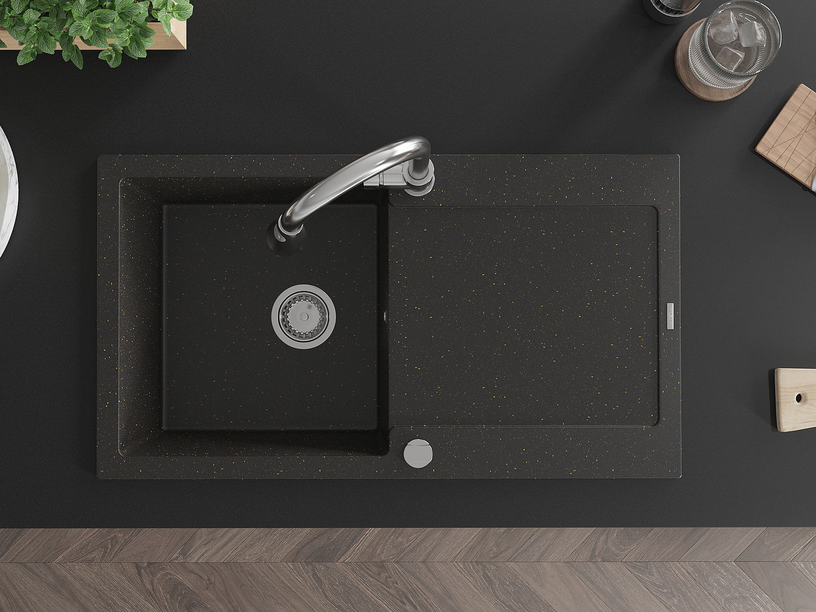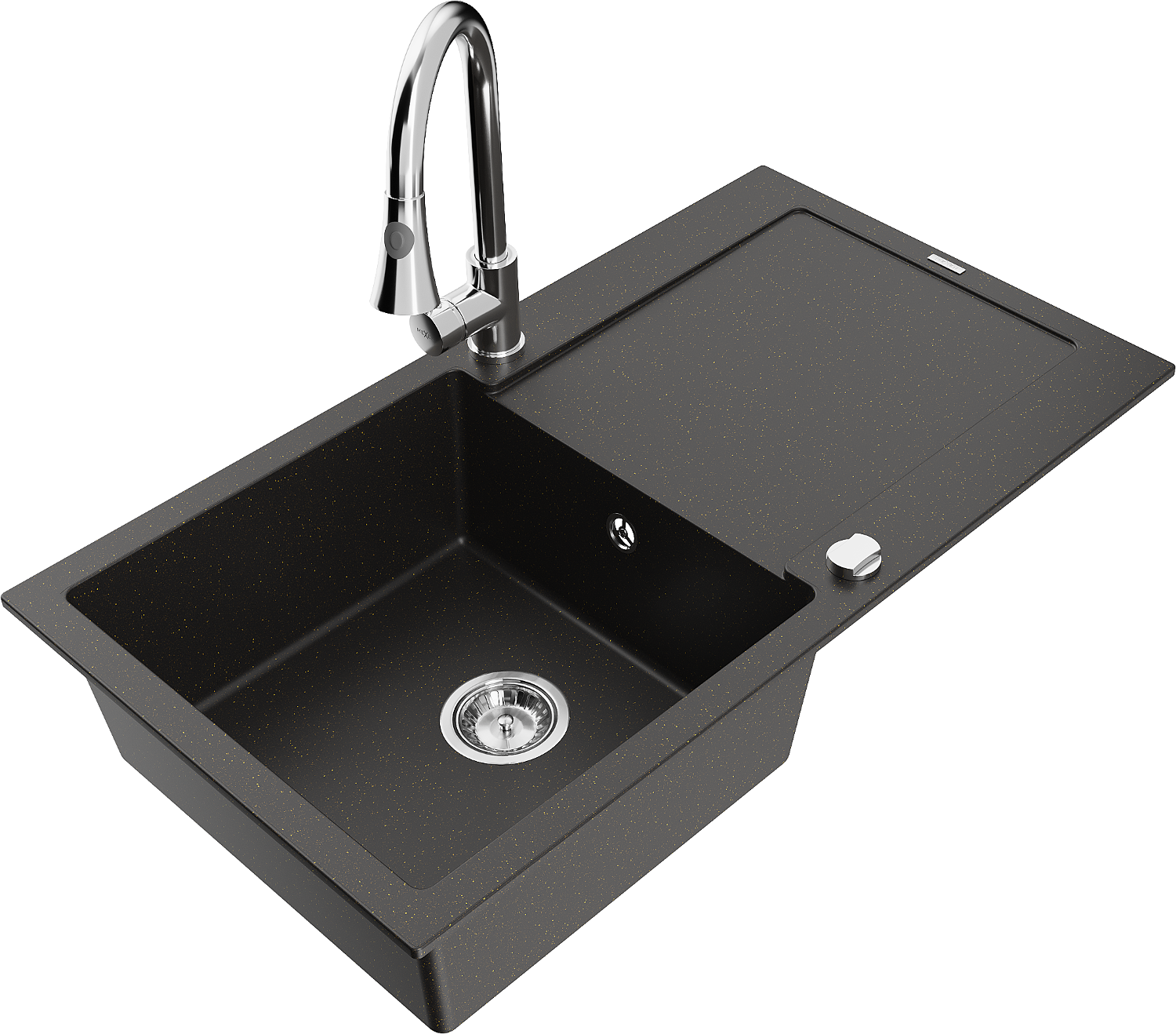 Mexen Leo évier en granit 1 bac avec égouttoir et robinet de cuisine Elia, noir/doré métallisé - 6501-75-670101-00