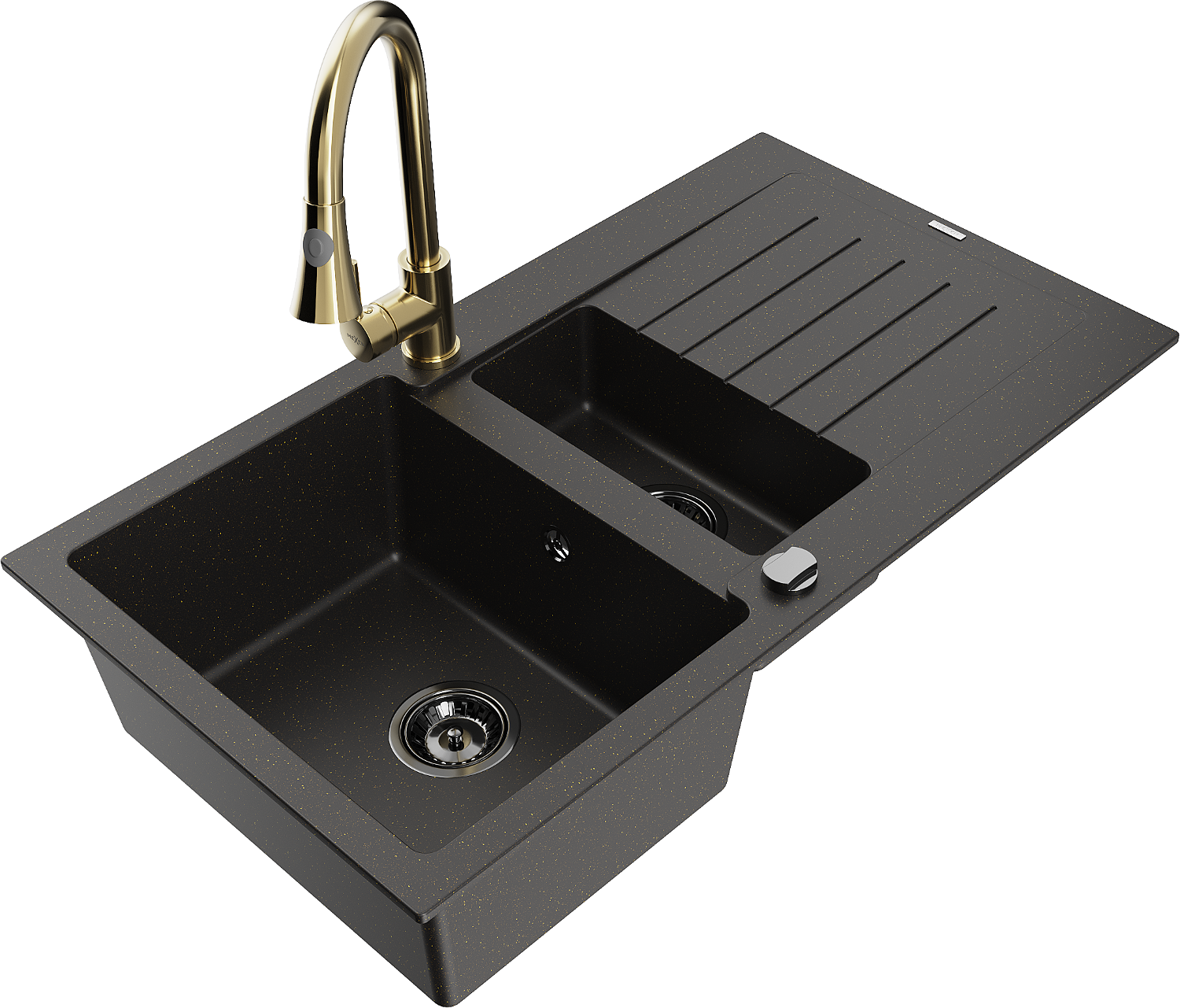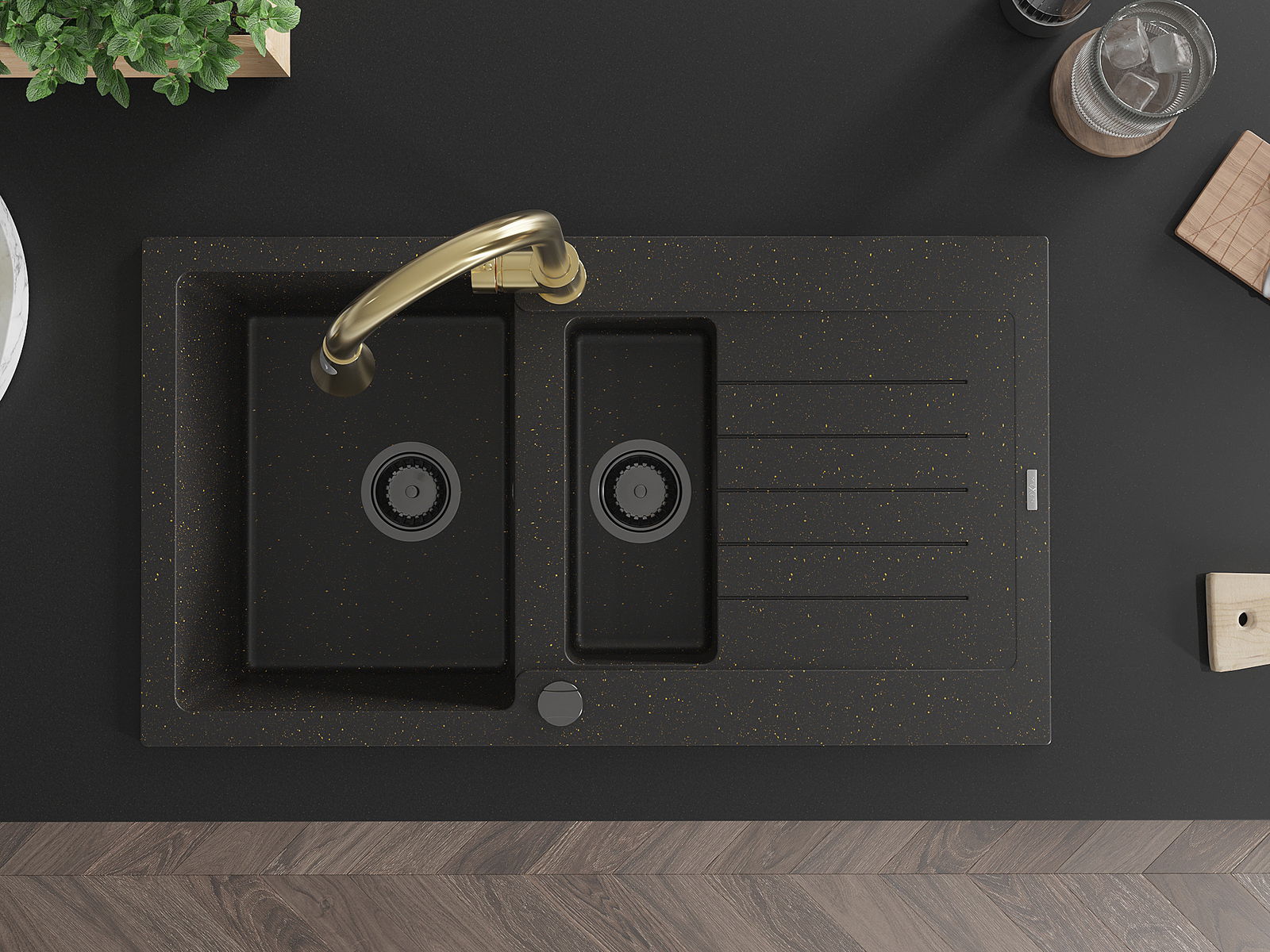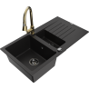 Mexen Matias évier en granit 1,5 bac avec égouttoir et robinet de cuisine Elia, noir/doré métallisé - 6502-75-670101-50-B