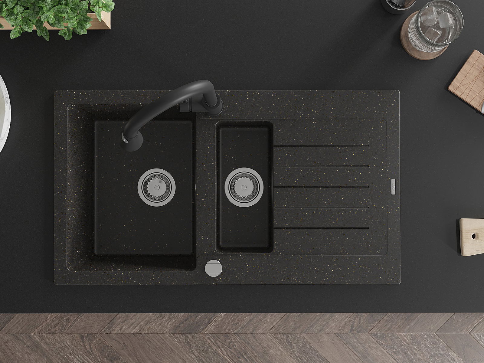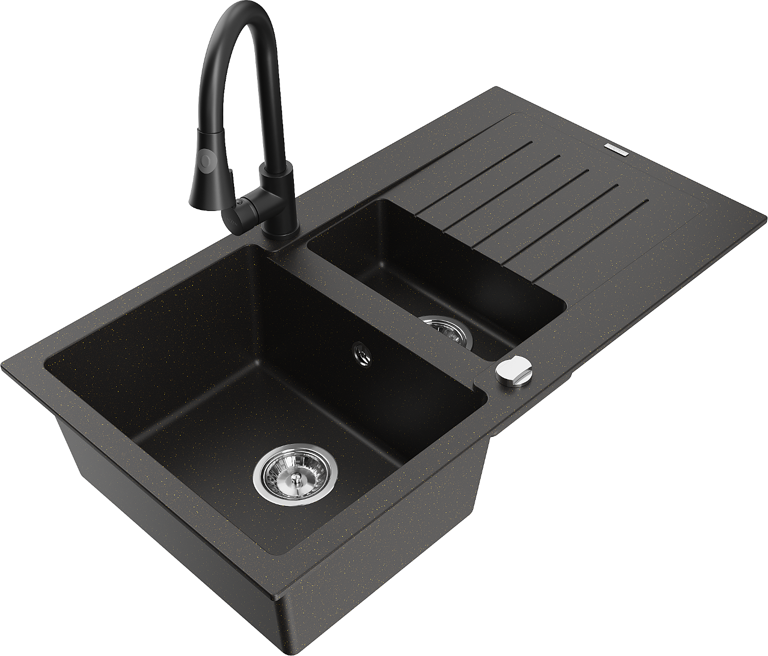Mexen Matias évier en granit 1,5 bac avec égouttoir et robinet de cuisine Elia, noir/doré métallique - 6502-75-670101-70