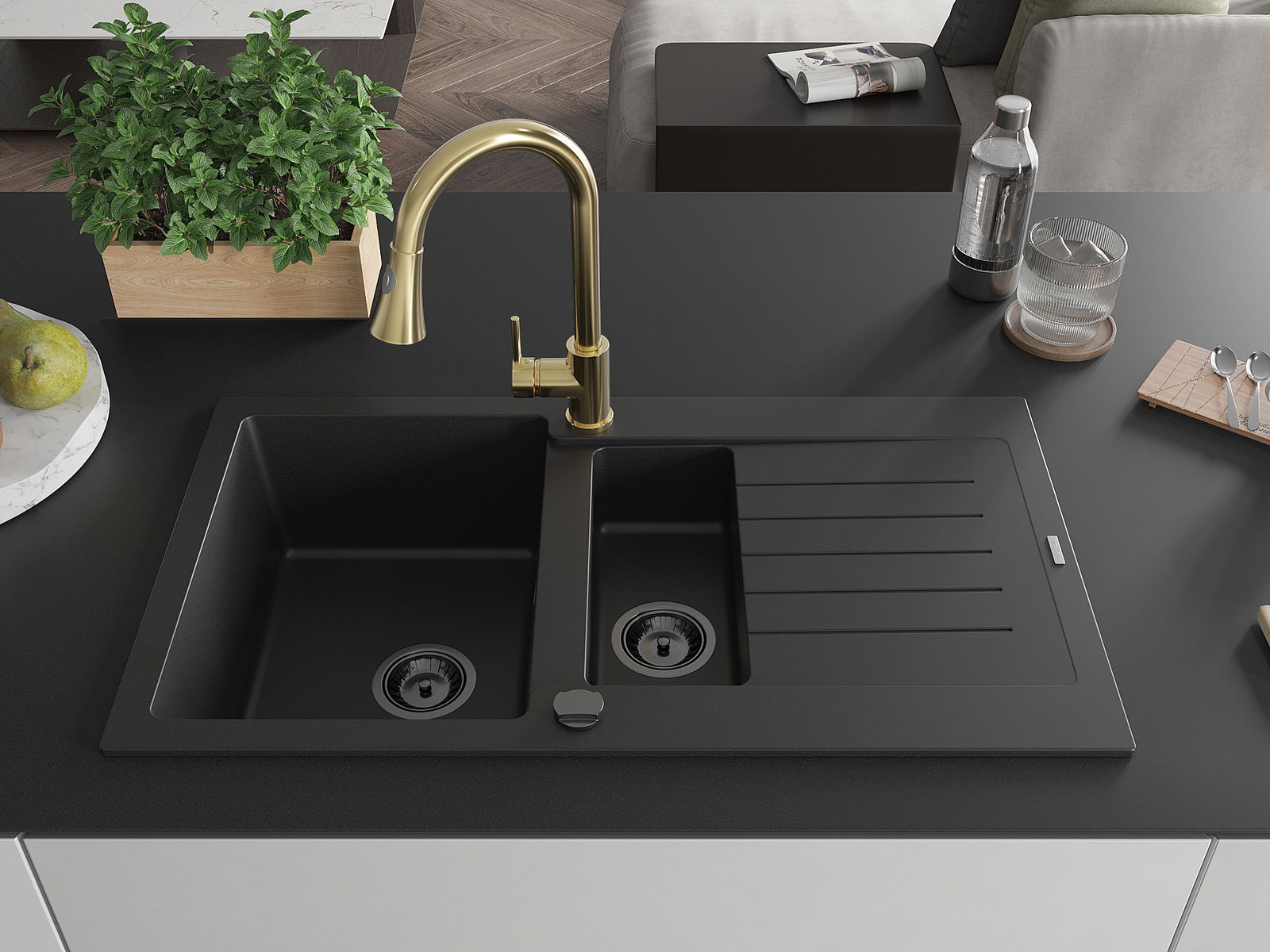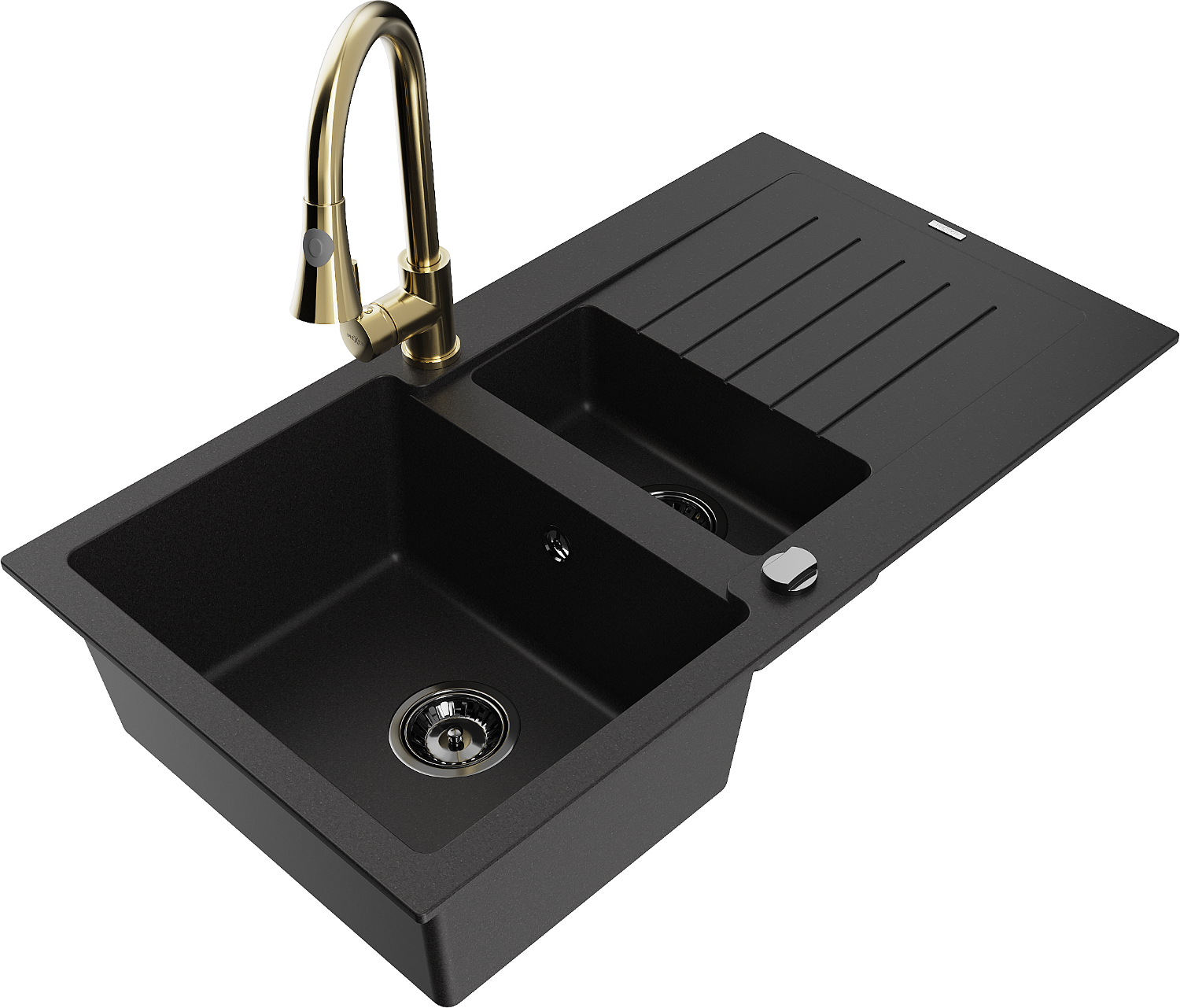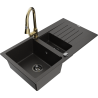 Mexen Matias évier en granit 1,5 bac avec égouttoir et robinet de cuisine Elia, noir - 6502-77-670101-50-B