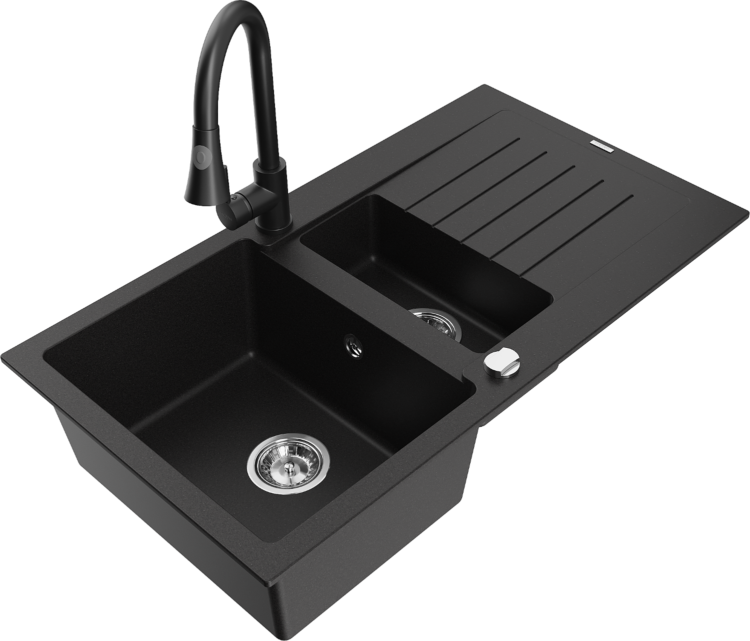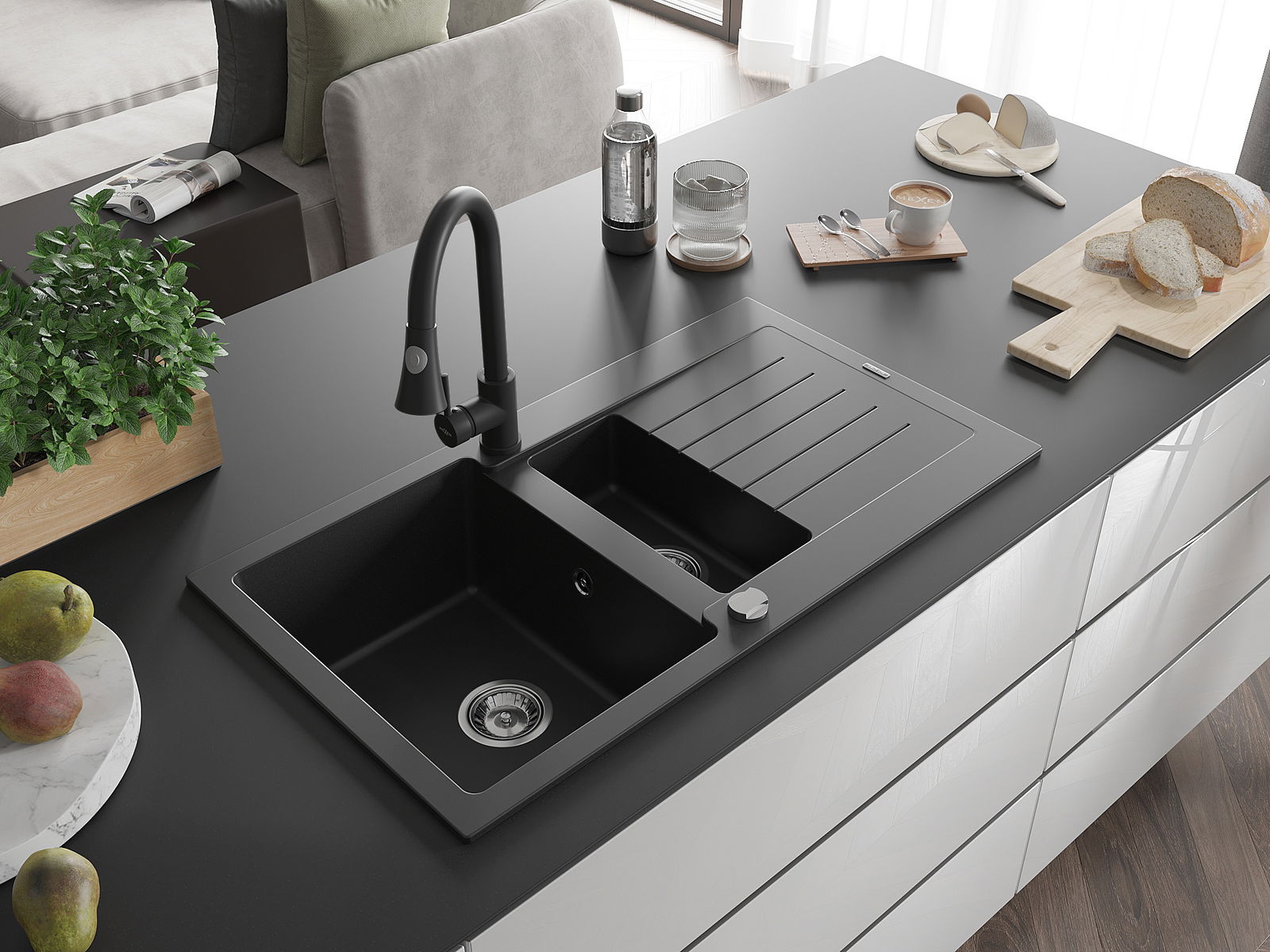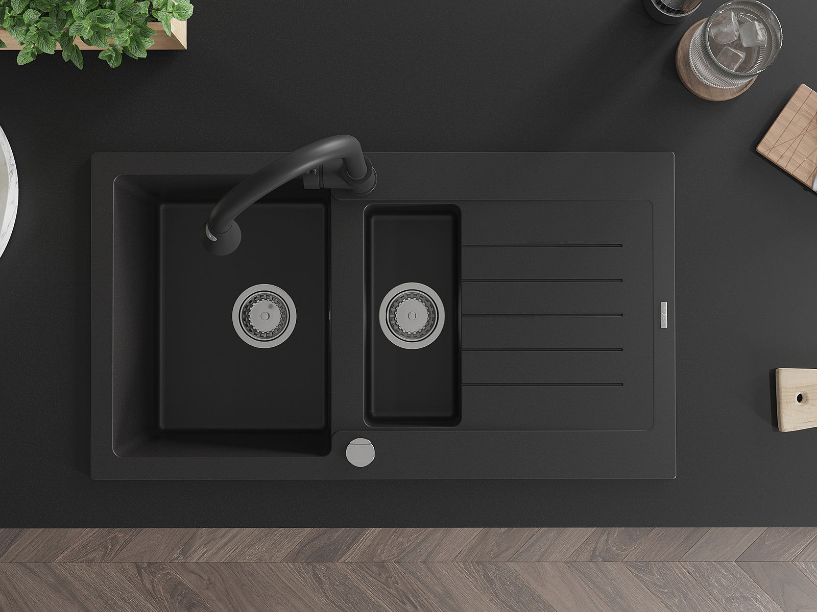 Mexen Matias évier en granit 1,5 bac avec égouttoir et robinet de cuisine Elia, noir - 6502-77-670101-70