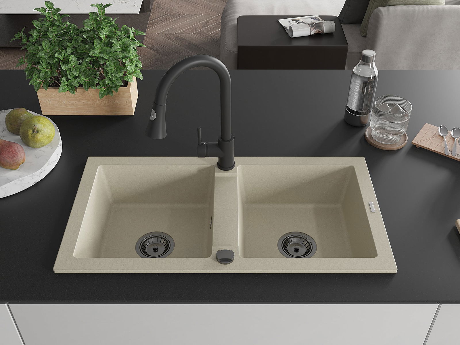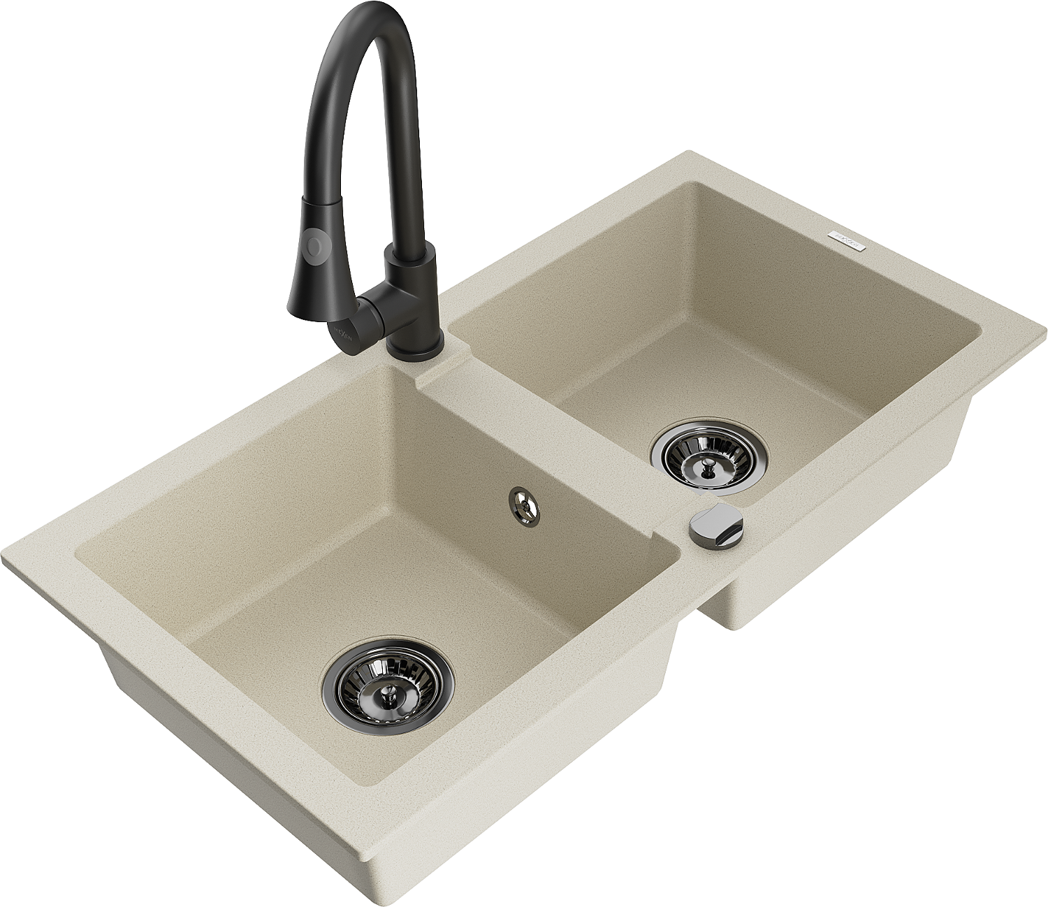 Mexen Mario évier en granit à 2 bacs avec robinet de cuisine Elia, beige - 6504-69-670101-70