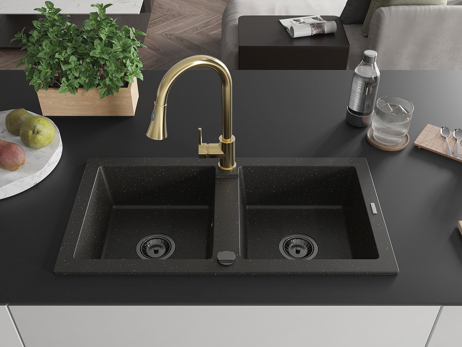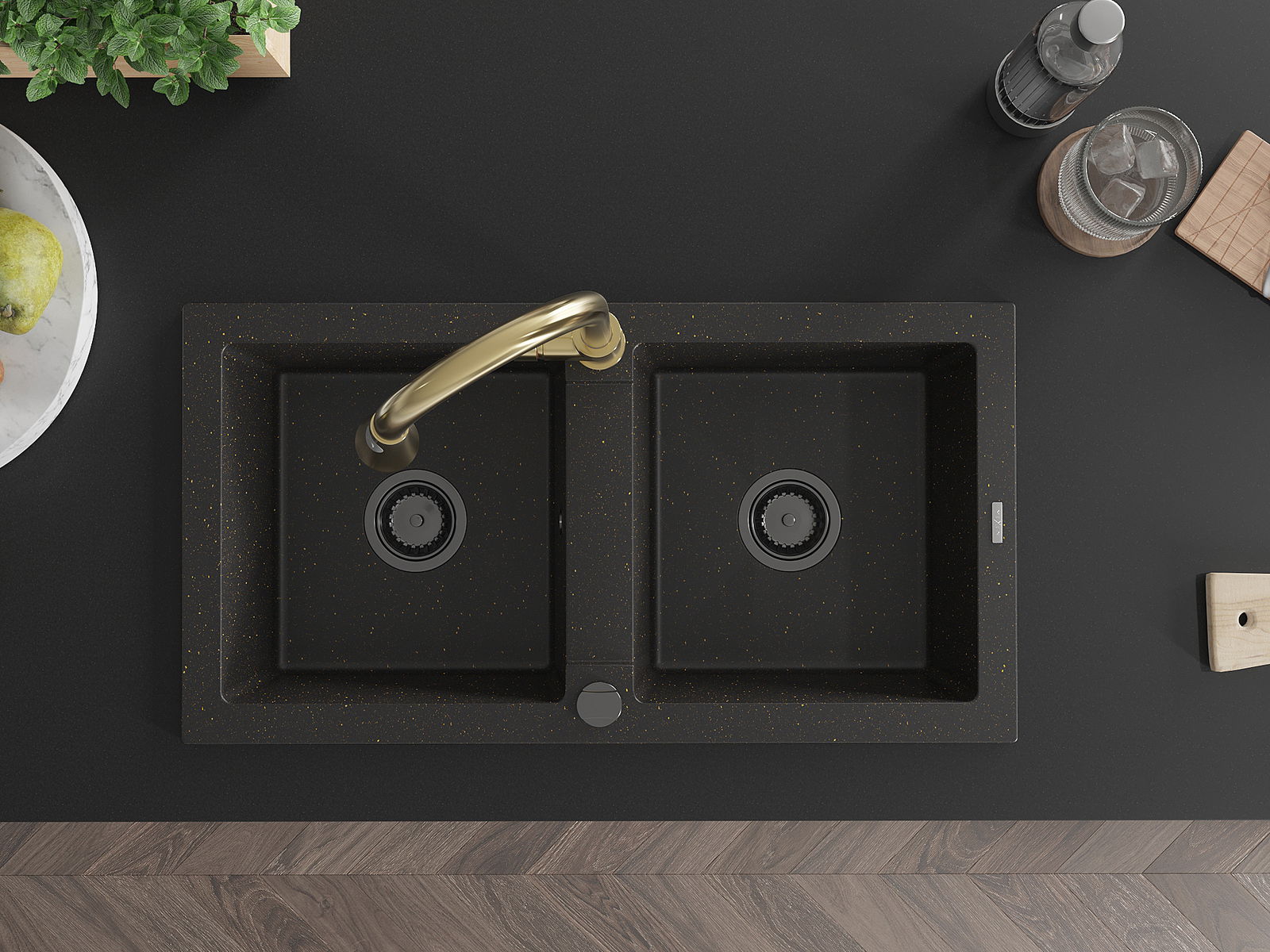 Mexen Mario évier en granit à 2 bacs avec robinet de cuisine Elia, noir/métallisé doré - 6504-75-670101-50-B