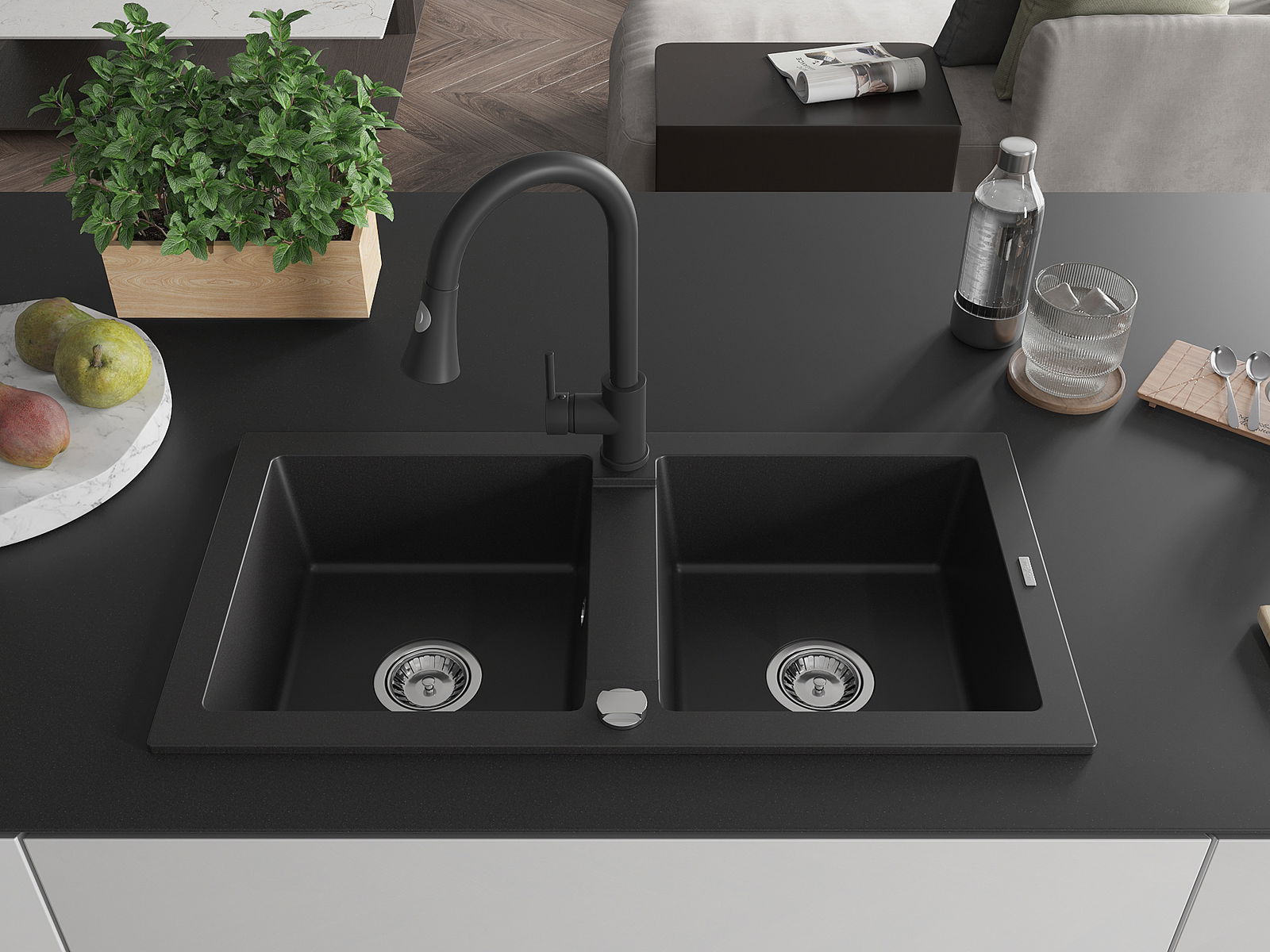 Mexen Mario évier en granit à 2 bacs avec robinet de cuisine Elia, noir - 6504-77-670101-70