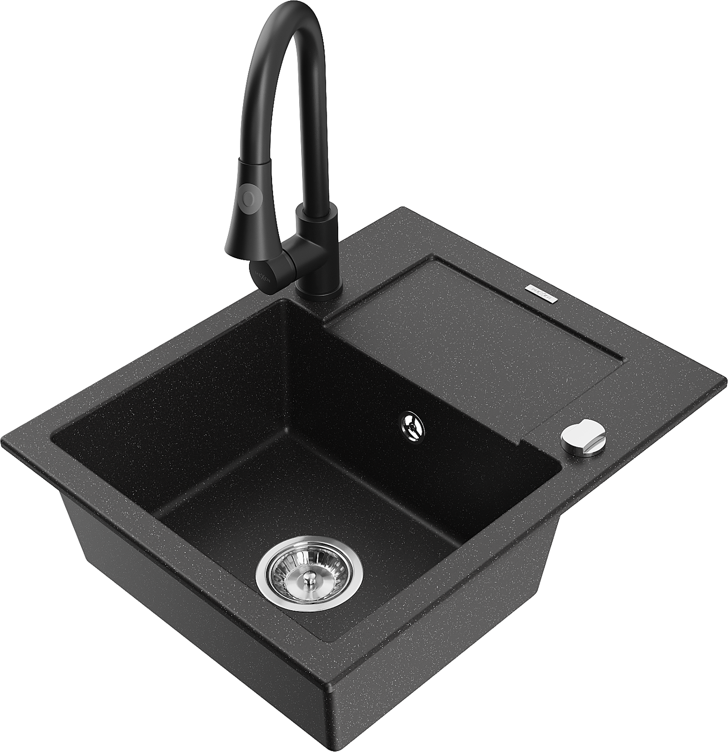 Mexen Enzo évier en granit 1 cuve avec égouttoir et robinet de cuisine Elia, noir/argent métallique - 6506-73-670101-70