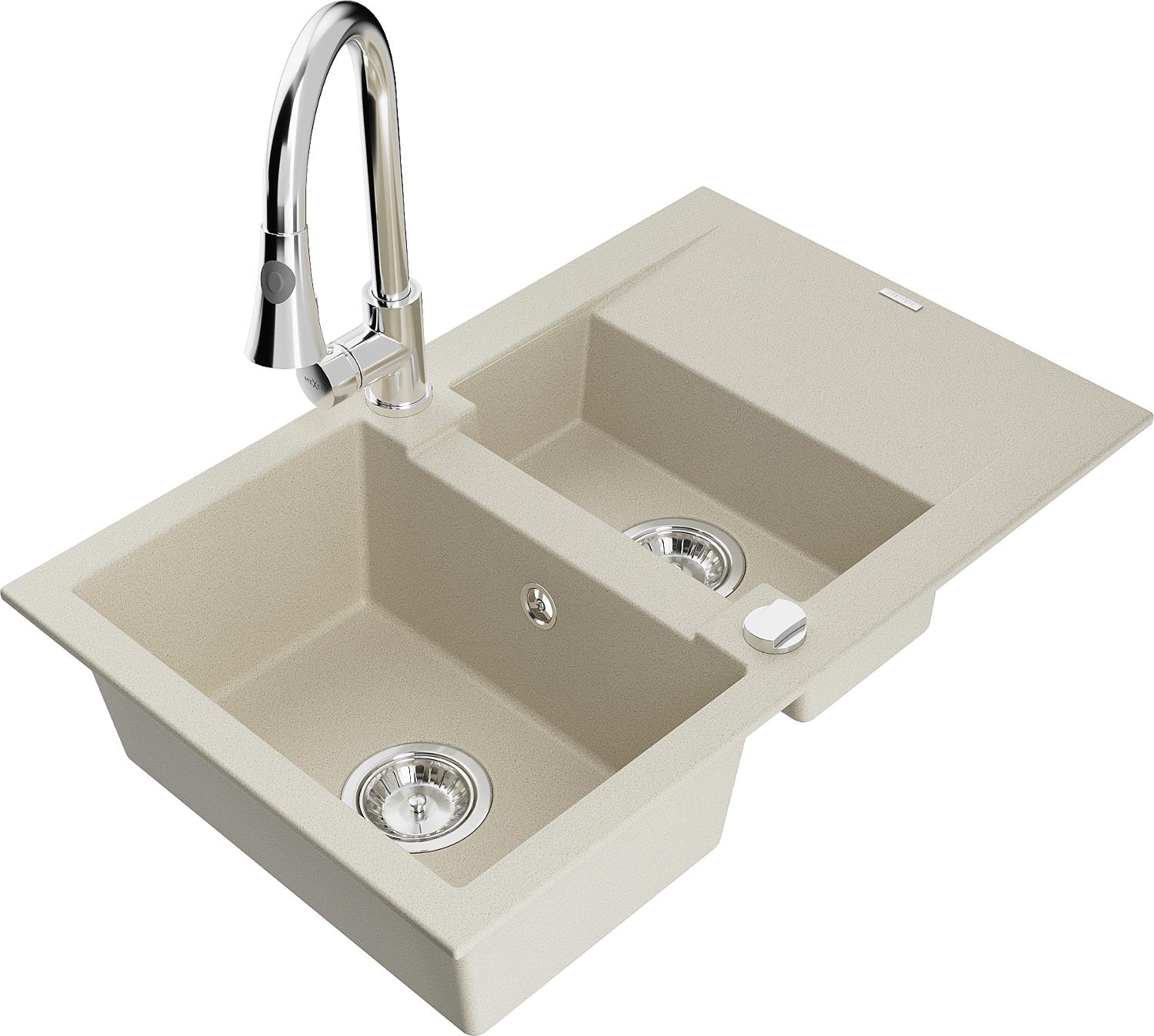 Mexen Gaspar évier en granit 1,5 cuves avec égouttoir et robinet de cuisine Elia, beige - 6507-69-670101-00