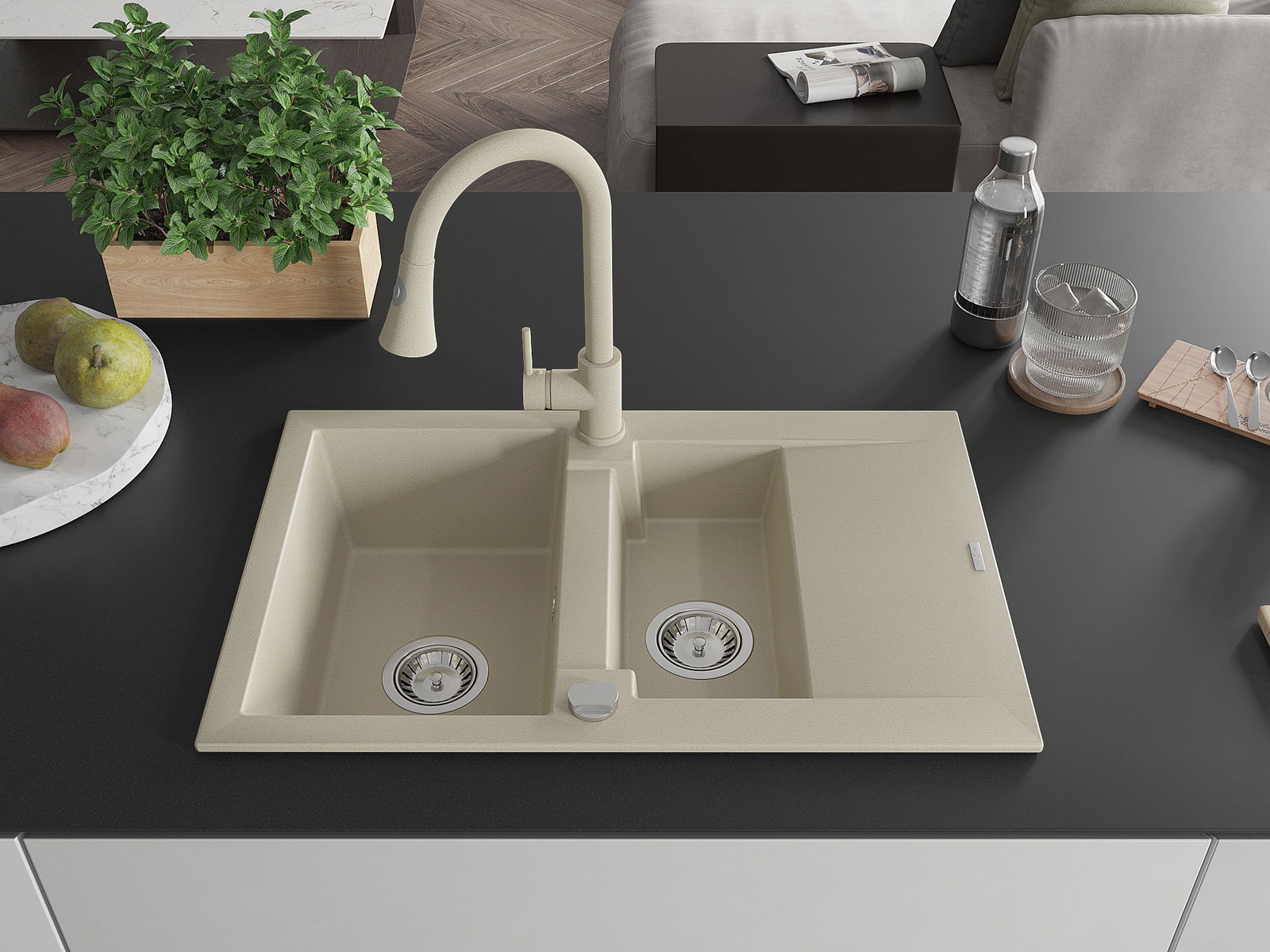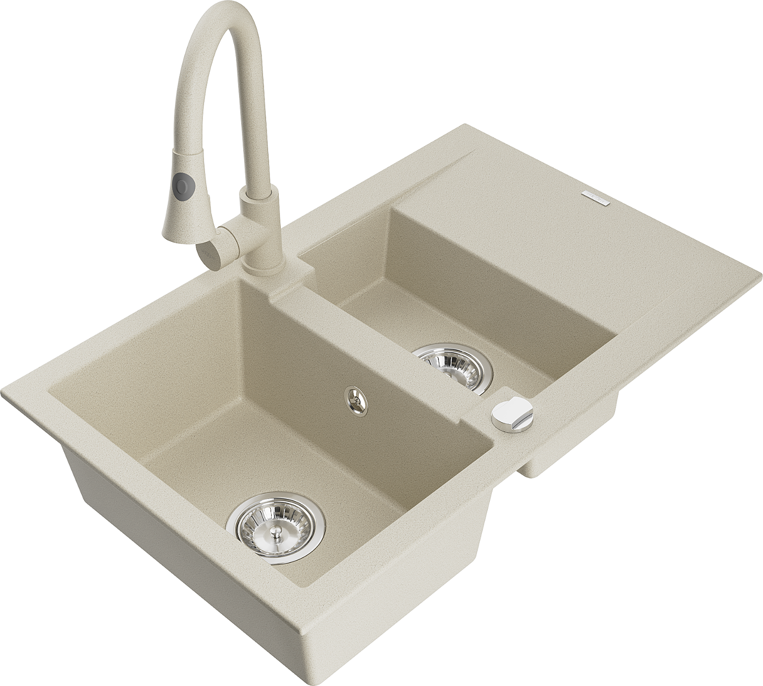 Mexen Gaspar évier en granit 1,5 bac avec égouttoir et robinet de cuisine Elia, beige - 6507-69-670101-69