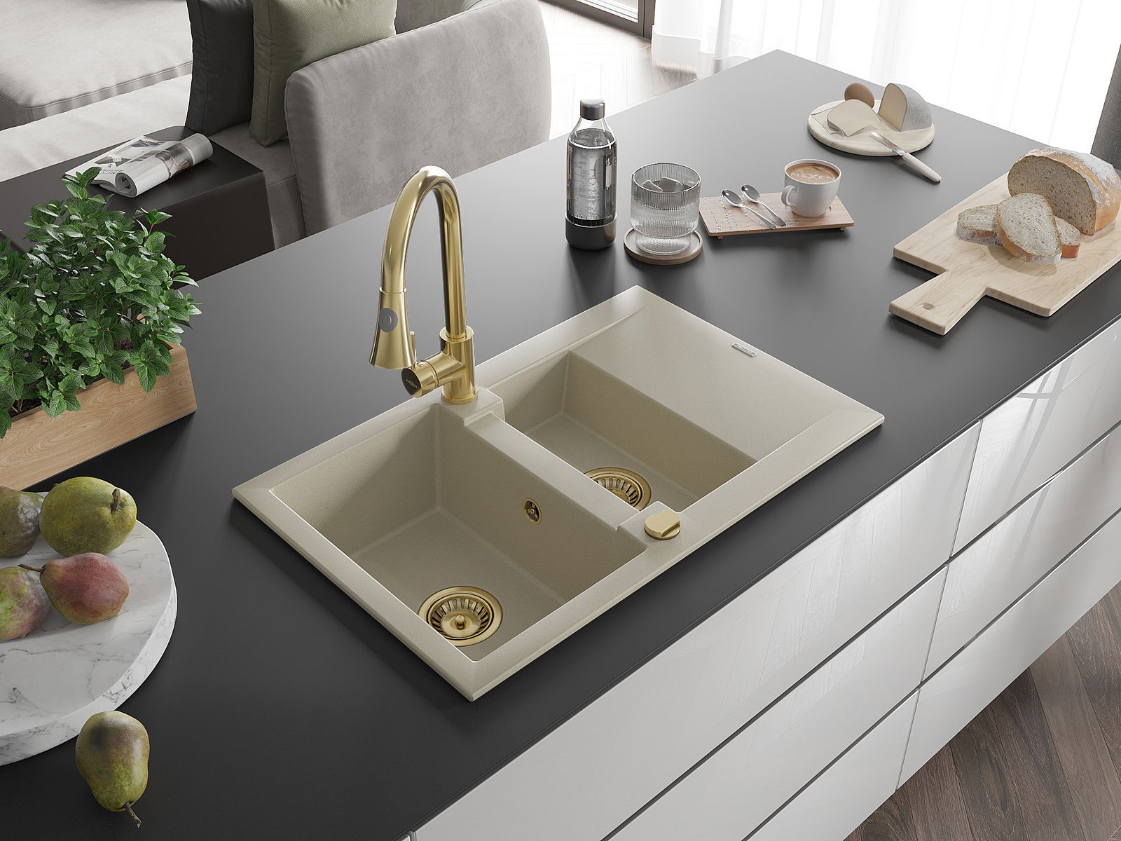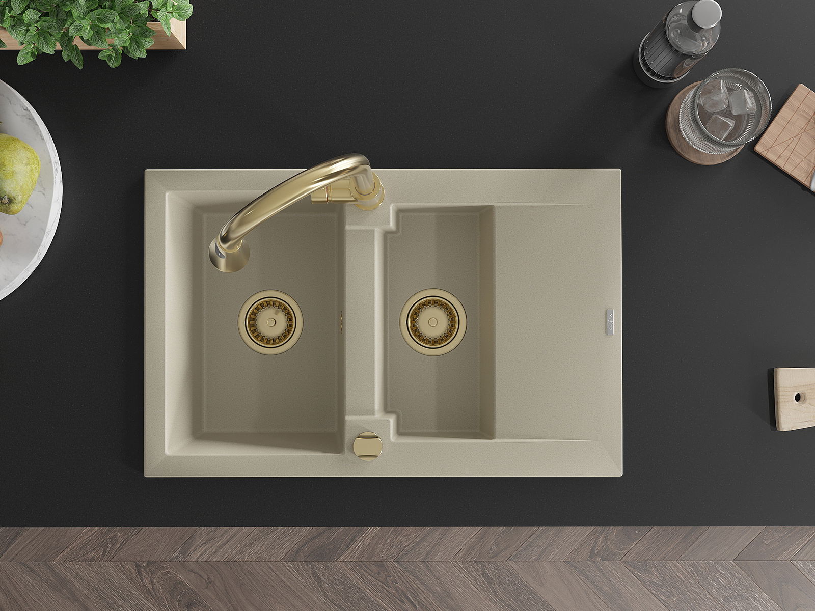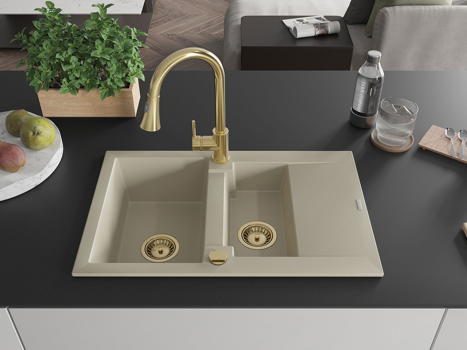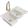 Mexen Gaspar évier en granit 1,5 bac avec égouttoir et robinet de cuisine Elia, beige - 6507-69-670101-50