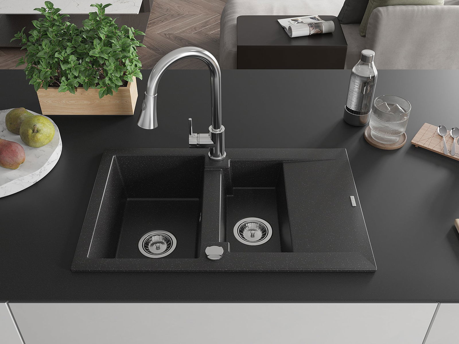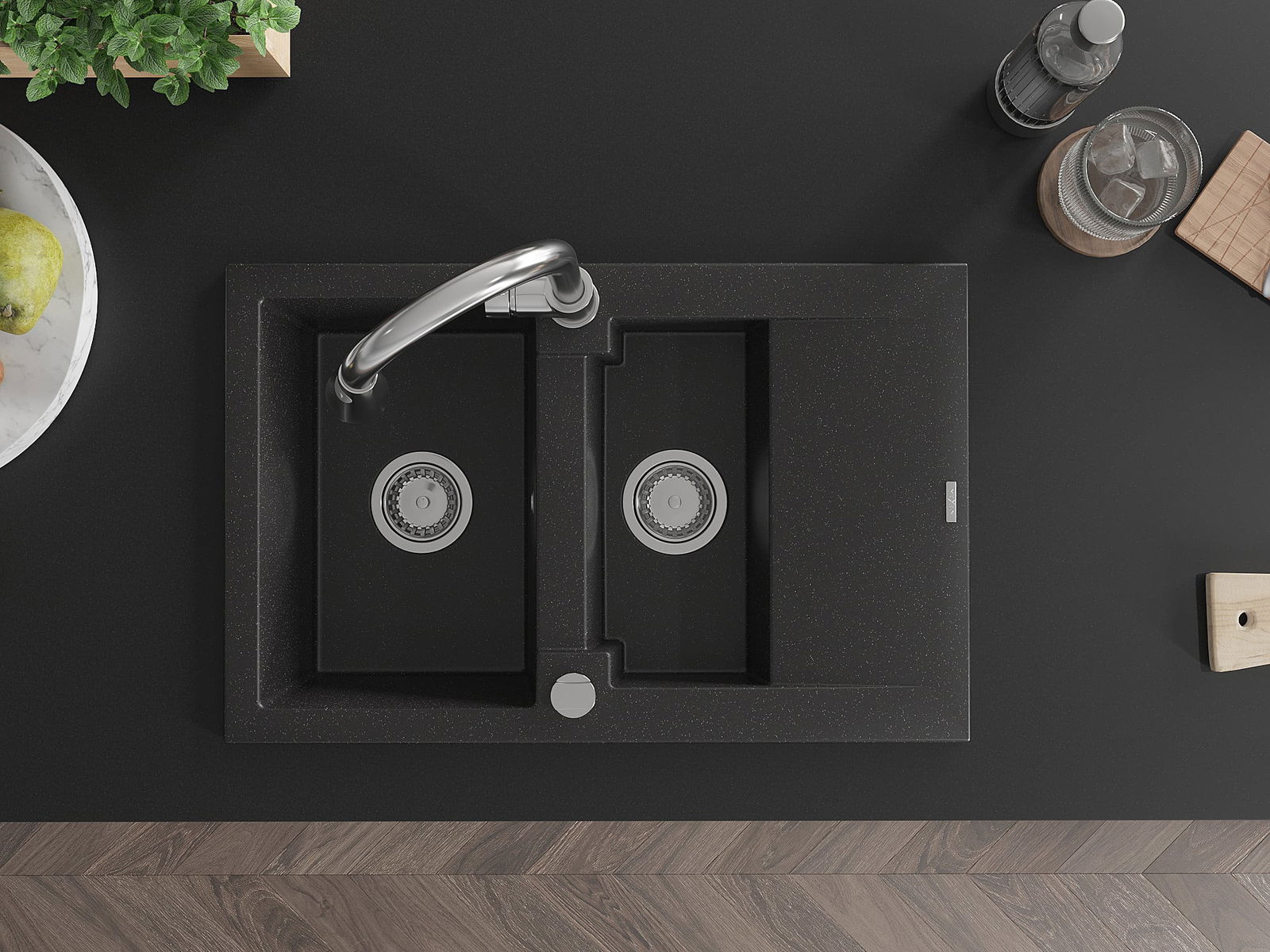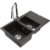 Mexen Gaspar évier en granit 1,5 bac avec égouttoir et robinet de cuisine Elia, noir/argent métallique - 6507-73-670101-00