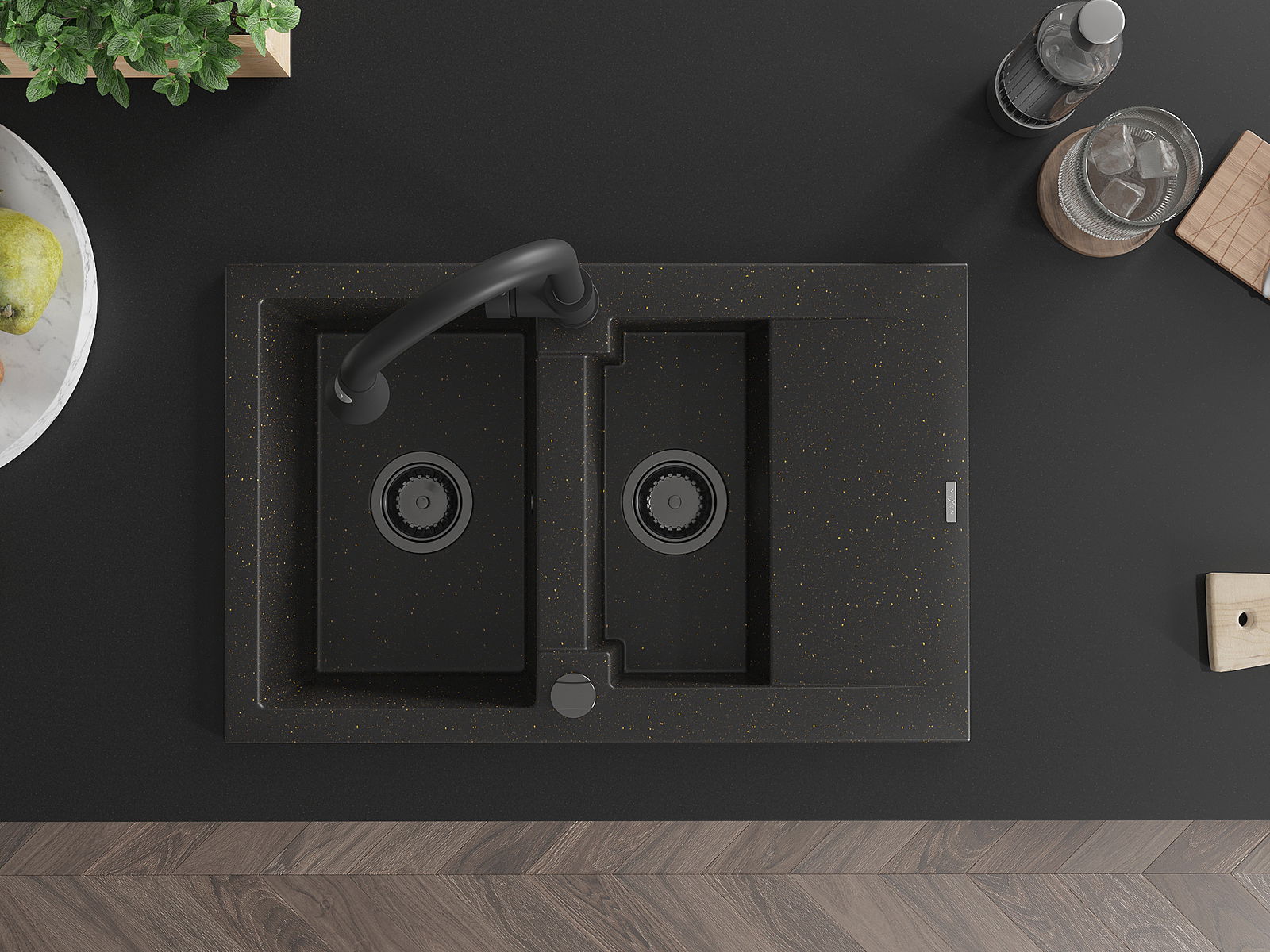 Mexen Gaspar évier en granit 1,5 bac avec égouttoir et robinet de cuisine Elia, noir/or métallique - 6507-75-670101-70-B