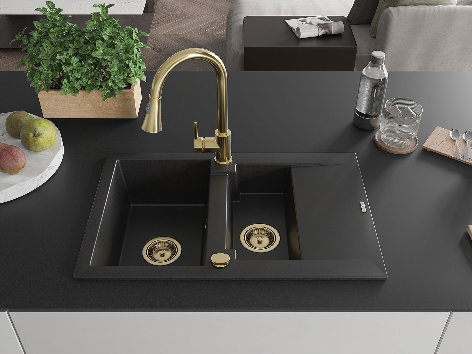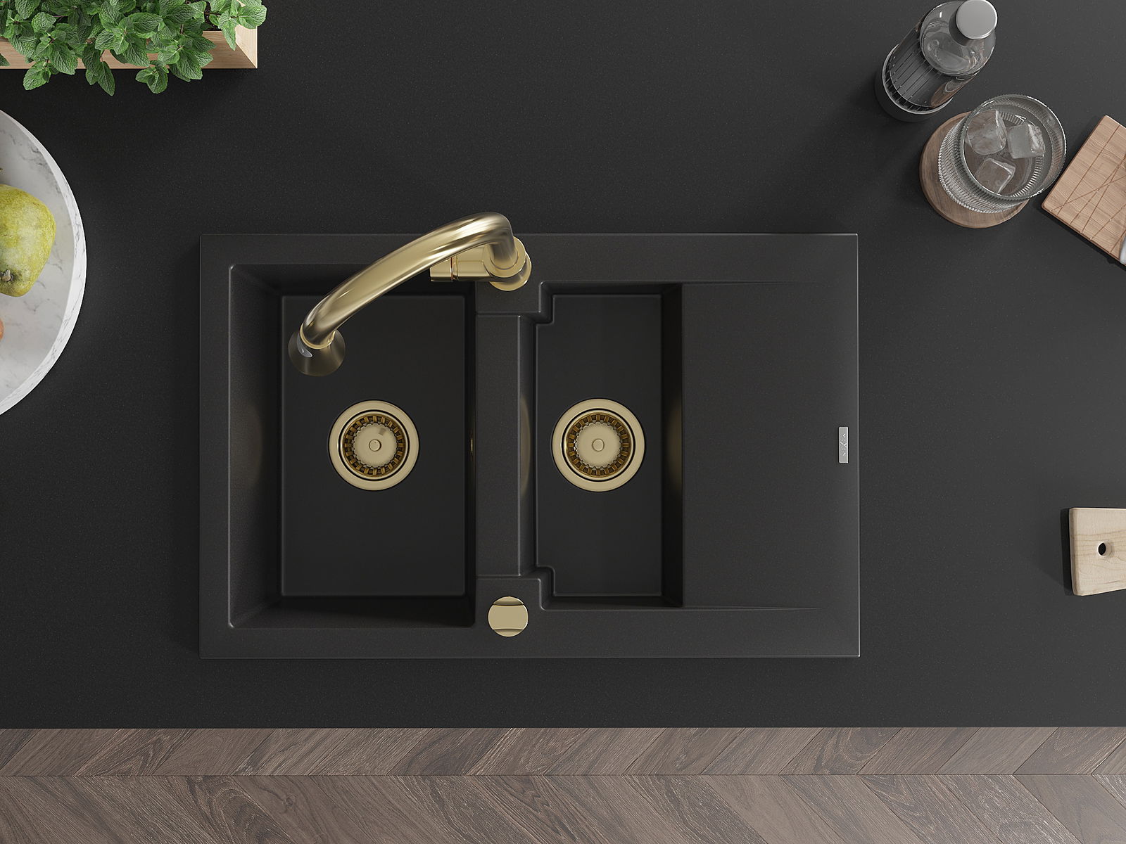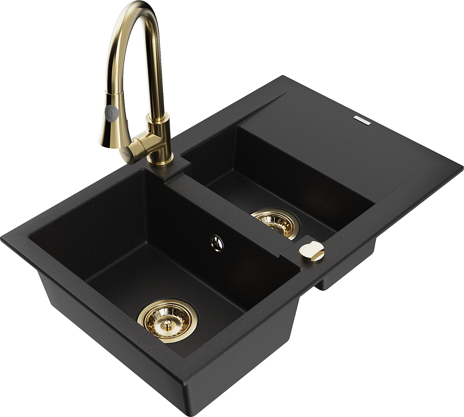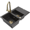 Mexen Gaspar évier en granit 1,5 cuves avec égouttoir et robinet de cuisine Elia, noir - 6507-77-670101-50