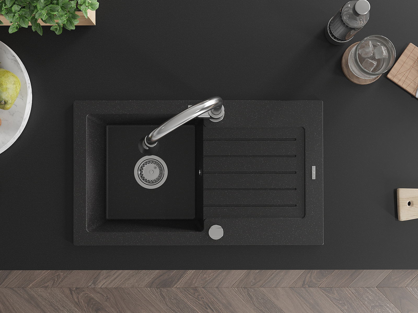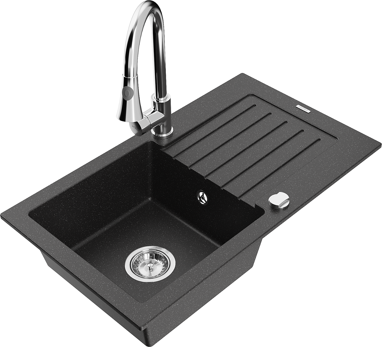 Mexen Pablo évier en granit à 1 bac avec égouttoir et robinet de cuisine Elia, noir/métallique argenté - 6510-73-670101-00
