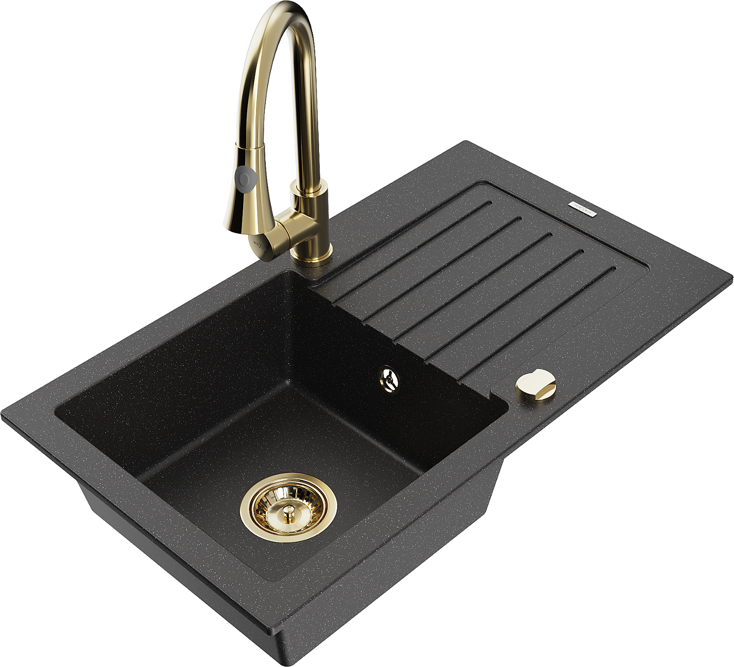Mexen Pablo évier de cuisine en granit 1 bac avec égouttoir et robinet de cuisine Elia, noir/métal argenté - 6510-73-670101-50