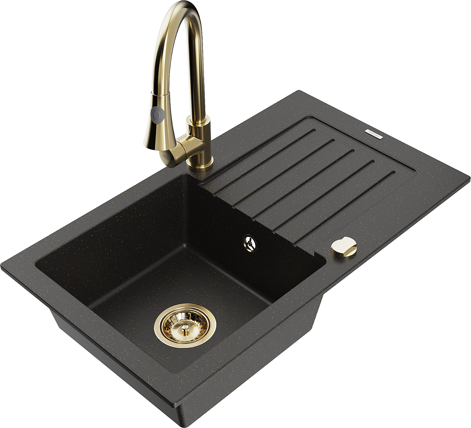 Mexen Pablo évier en granit 1 bac avec égouttoir et robinet de cuisine Elia, noir/doré métallisé - 6510-75-670101-50