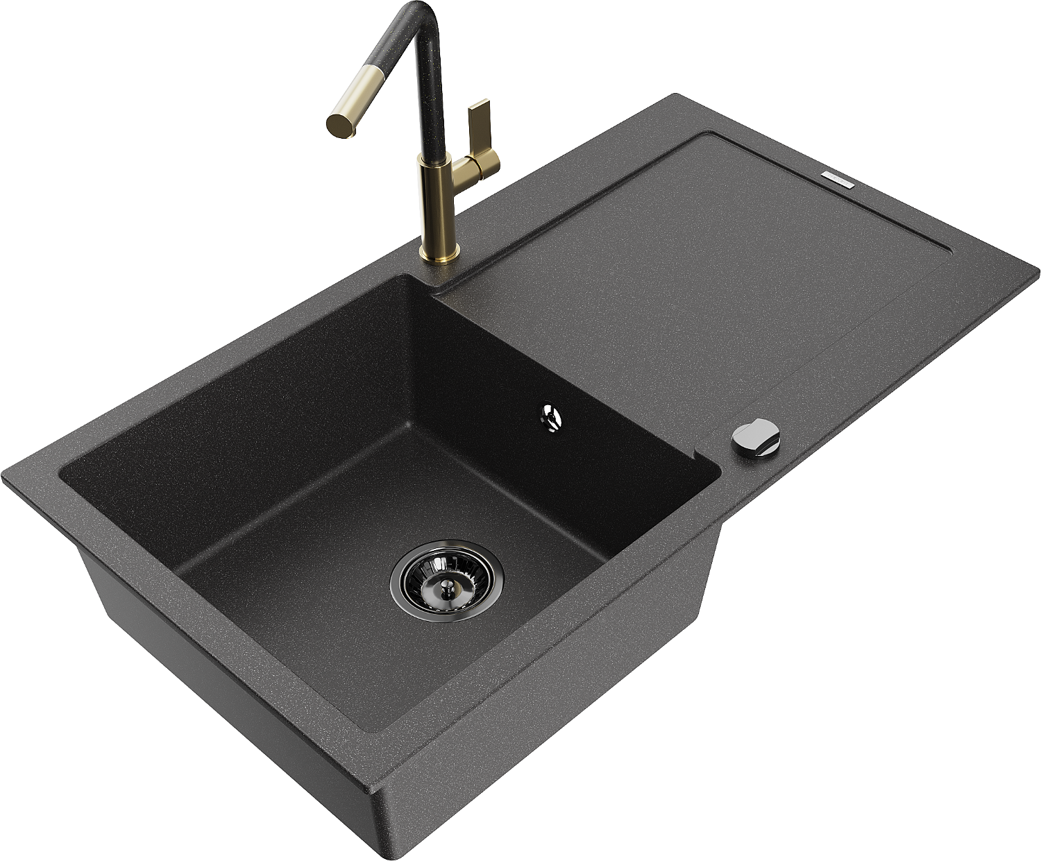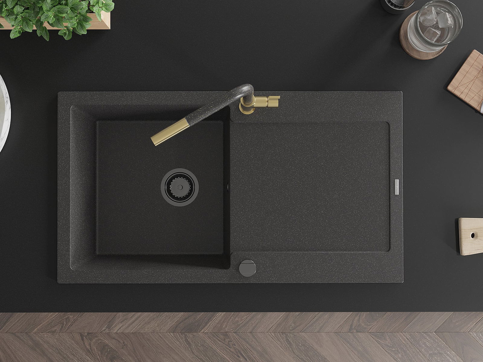 Mexen Leo évier en granit 1 bac avec égouttoir et robinet de cuisine Flora, noir moucheté - 6501-76-670401-75-B