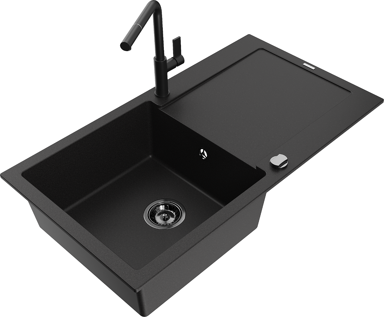 Mexen Leo évier en granit 1 bac avec égouttoir et robinet de cuisine Flora, noir - 6501-77-670401-70-B