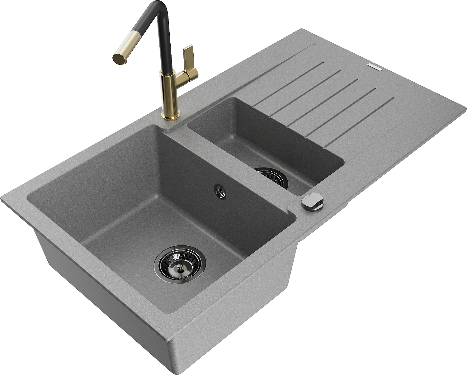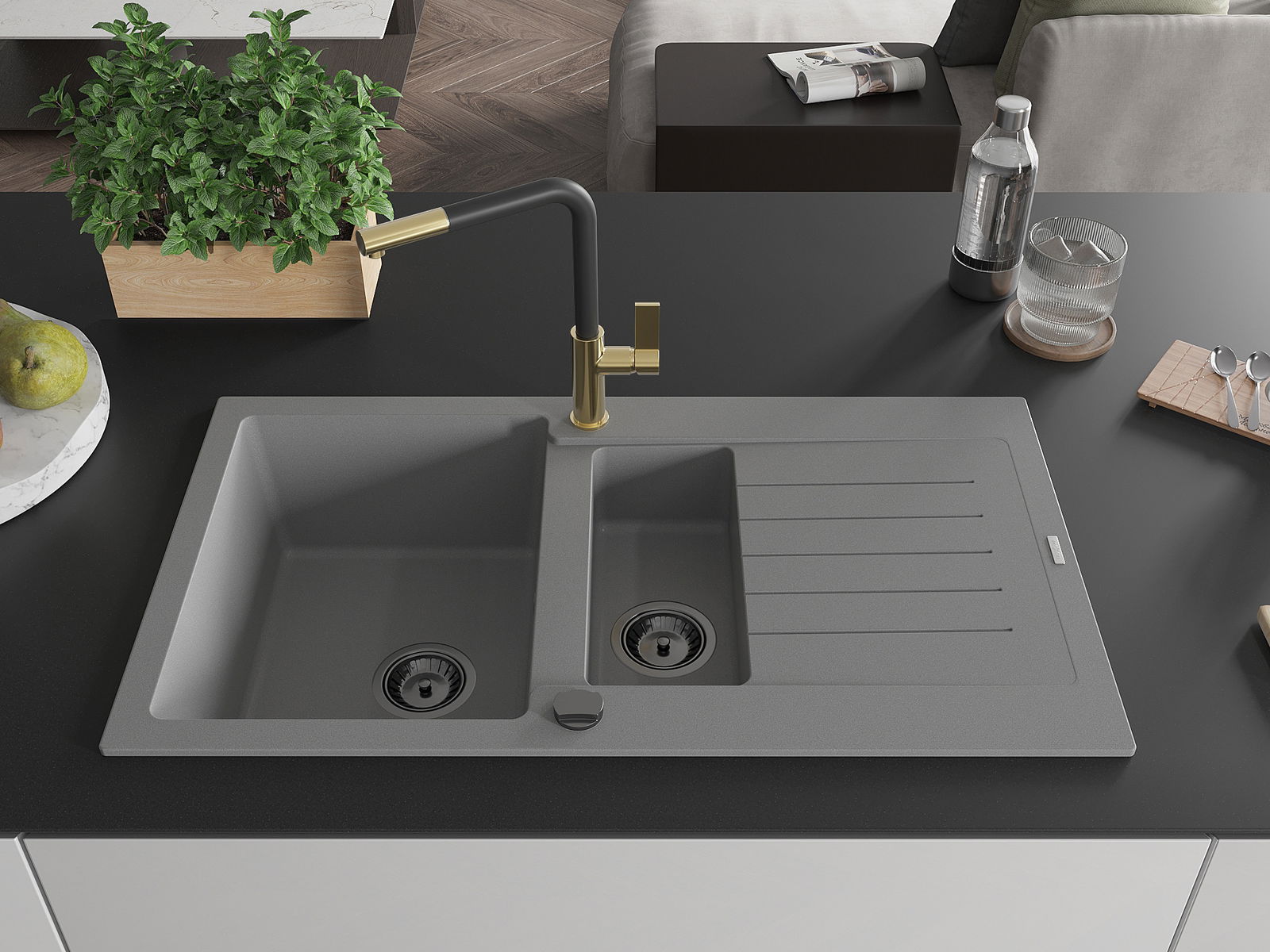 Mexen Matias évier en granit 1,5 bac avec égouttoir et robinet de cuisine Flora, gris - 6502-71-670401-57-B