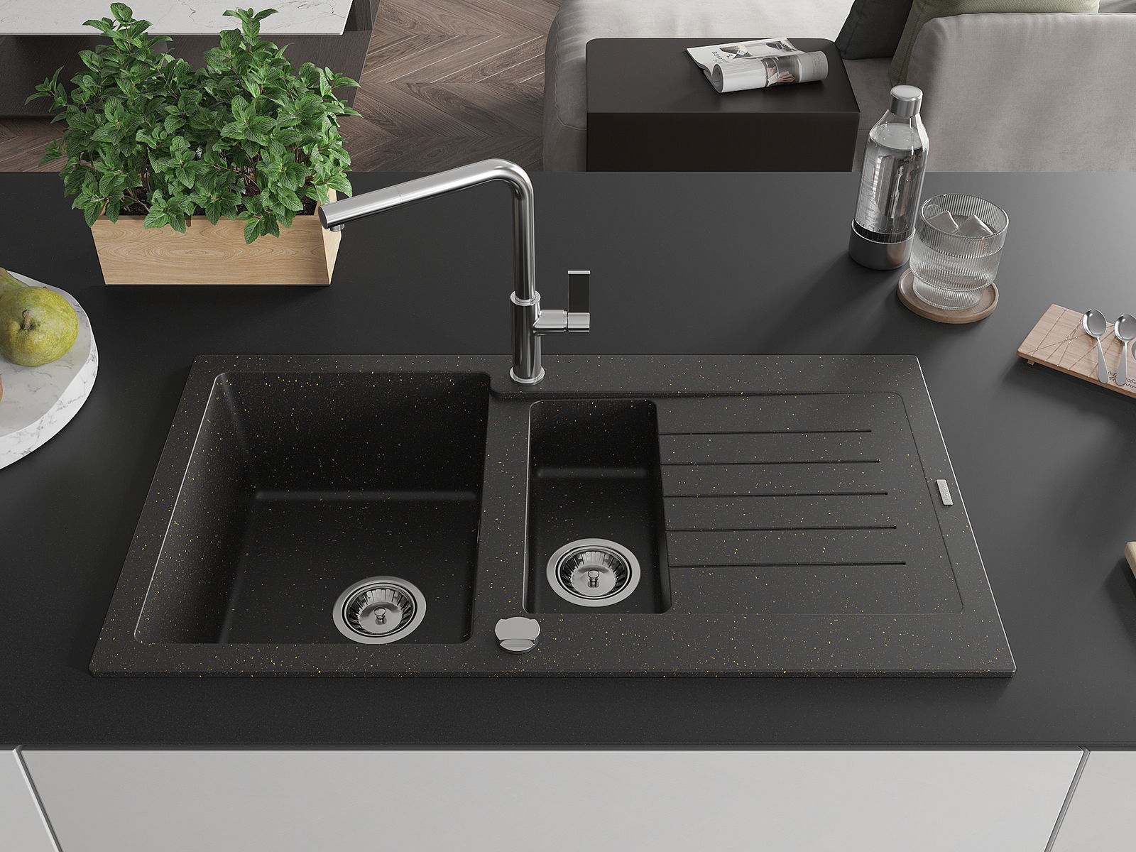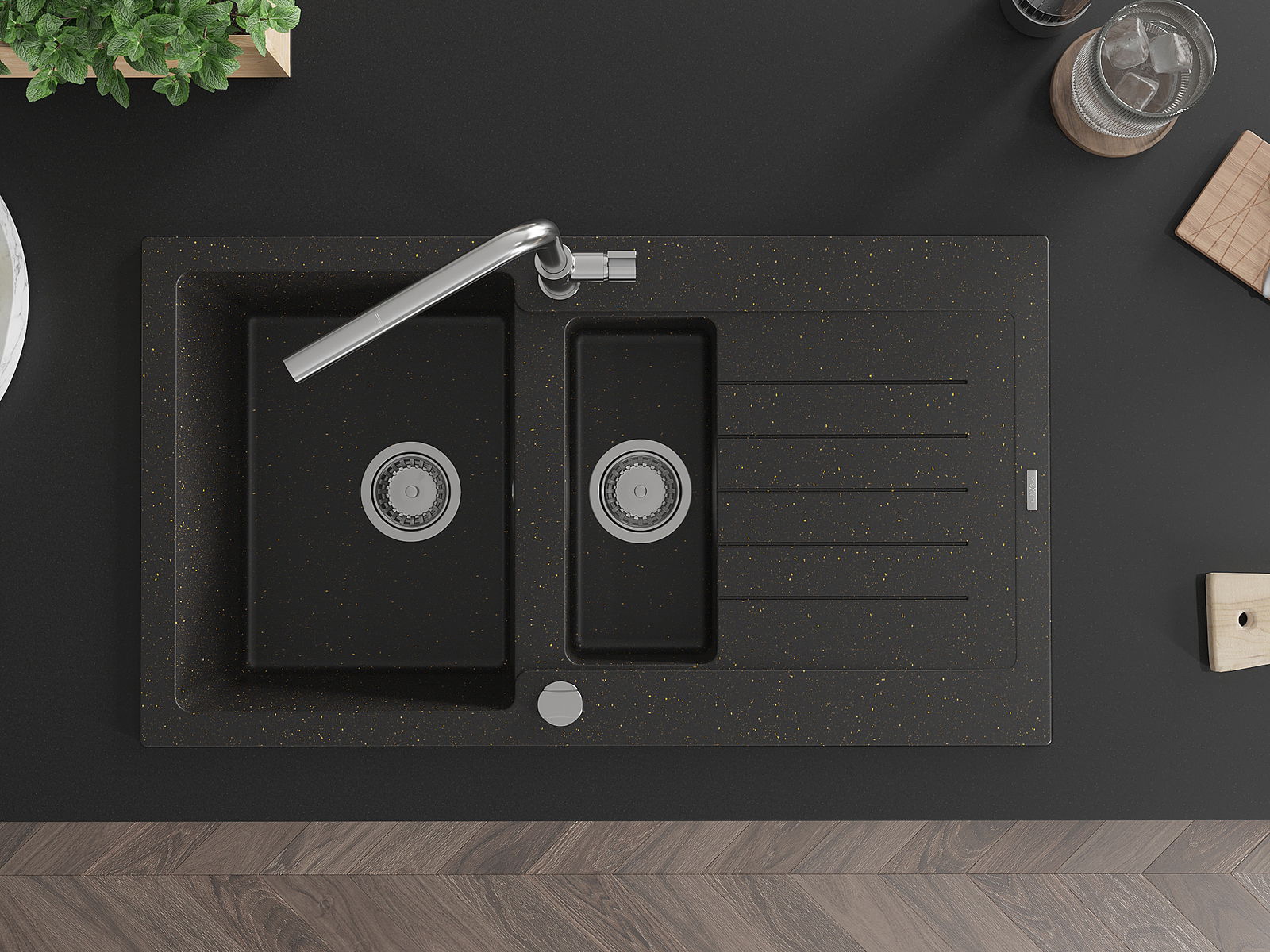 Mexen Matias évier en granit 1,5 bac avec égouttoir et robinet de cuisine Flora, noir/or métallique - 6502-75-670401-00