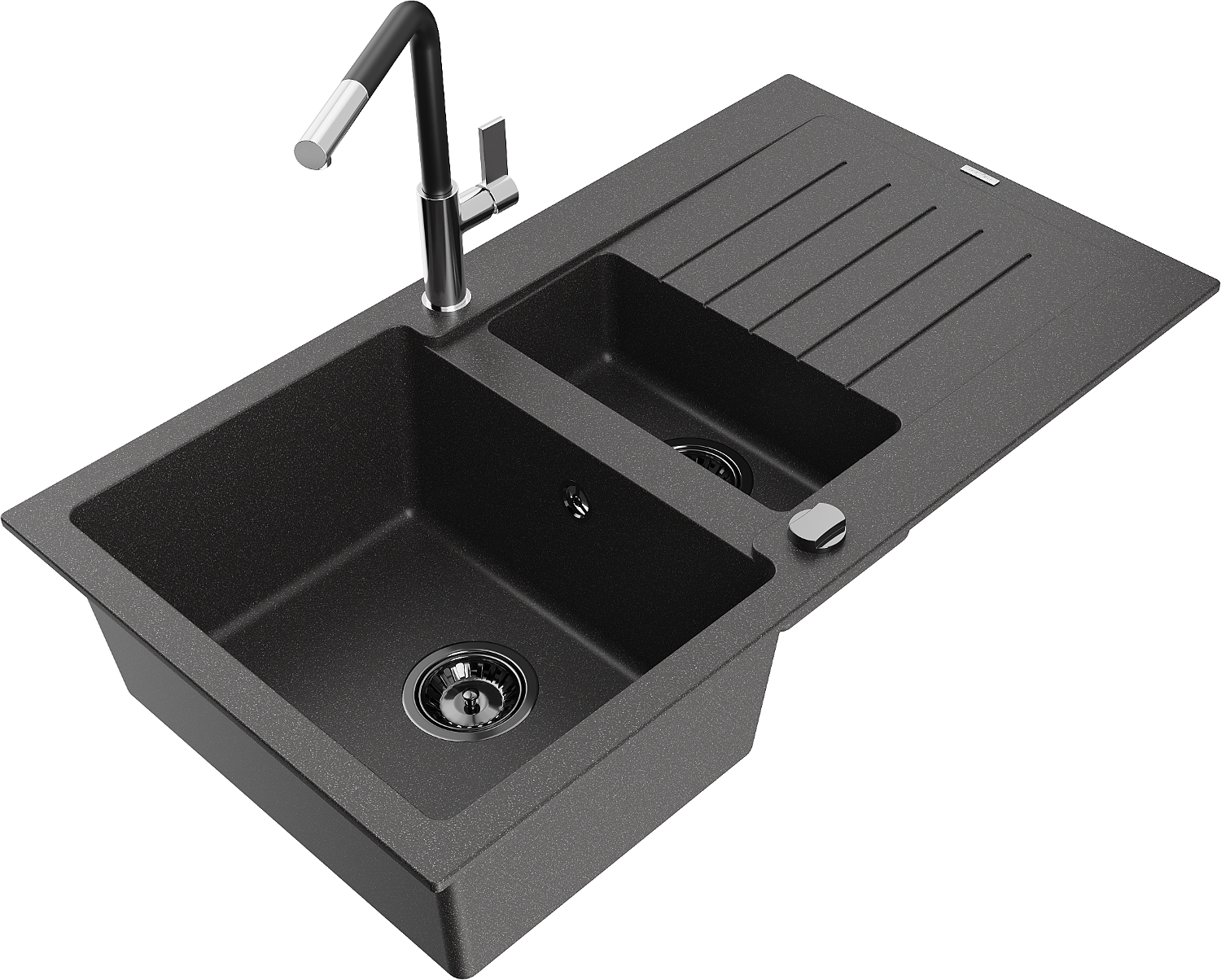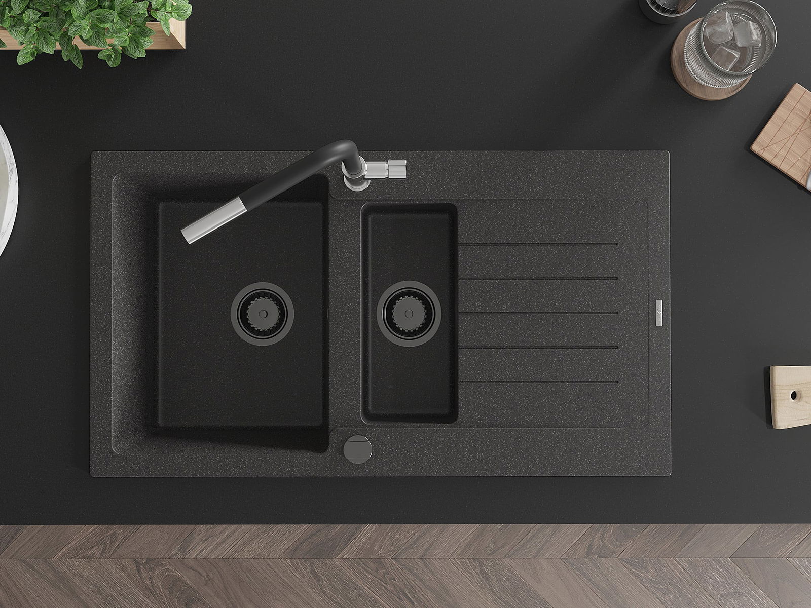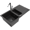 Mexen Matias évier en granit 1,5 bac avec égouttoir et robinet de cuisine Flora, noir moucheté - 6502-76-670401-07-B