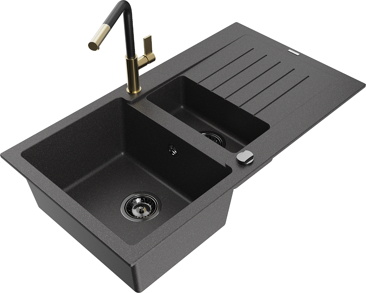 Mexen Matias évier en granit 1,5-bac avec égouttoir et mitigeur de cuisine Flora, noir moucheté - 6502-76-670401-57-B