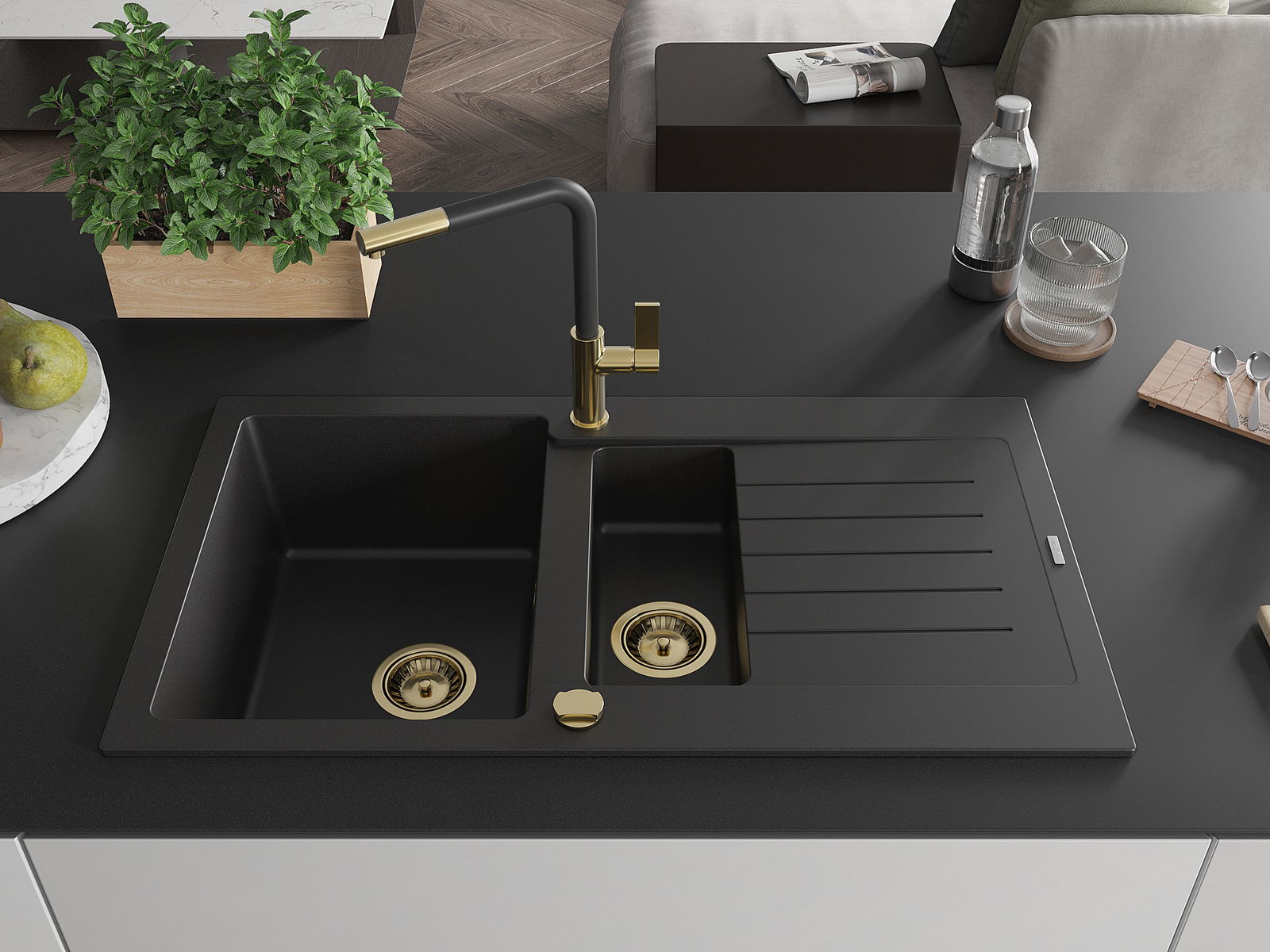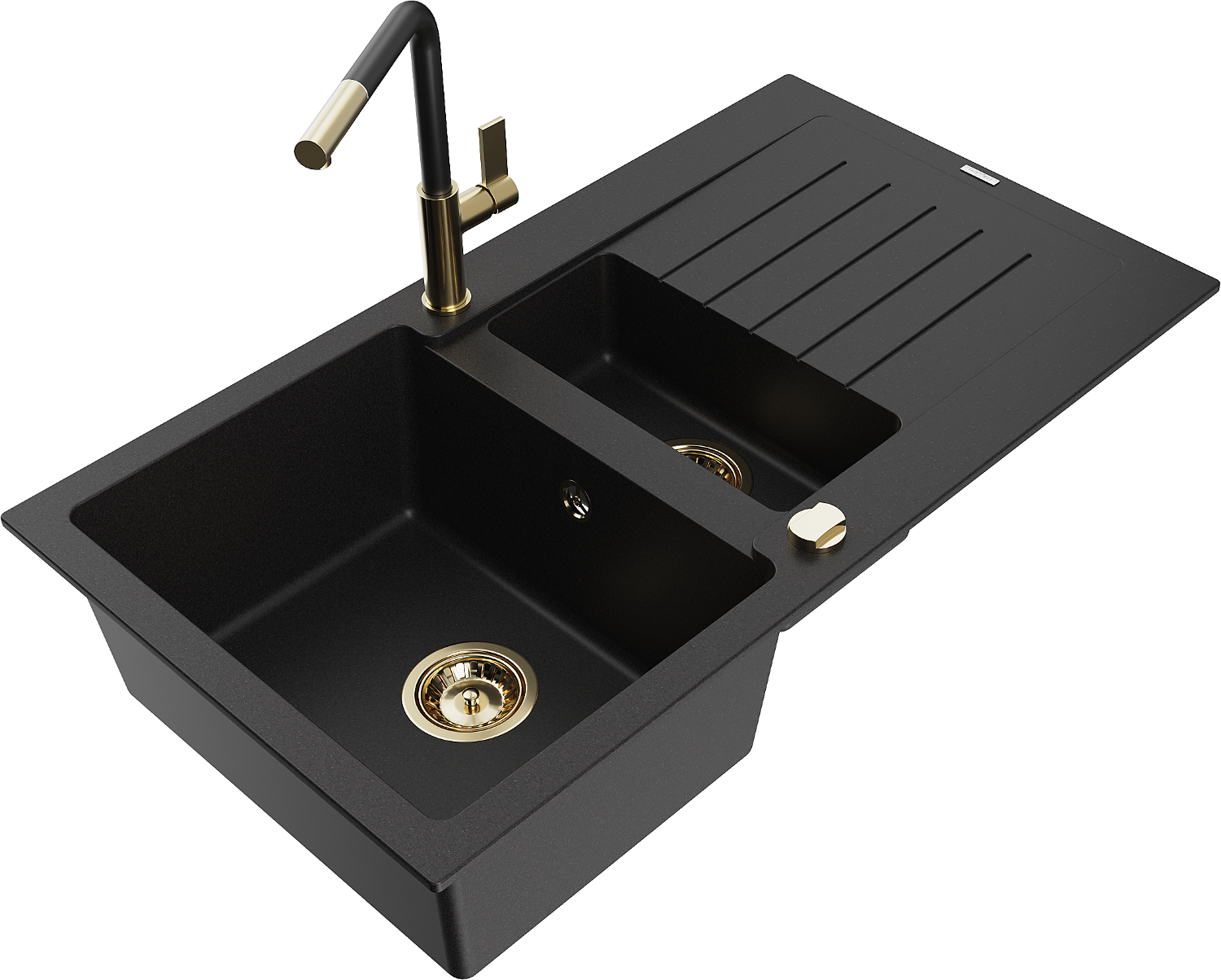 Mexen Matias évier en granit 1,5 bac avec égouttoir et robinet de cuisine Flora, noir - 6502-77-670401-57-G
