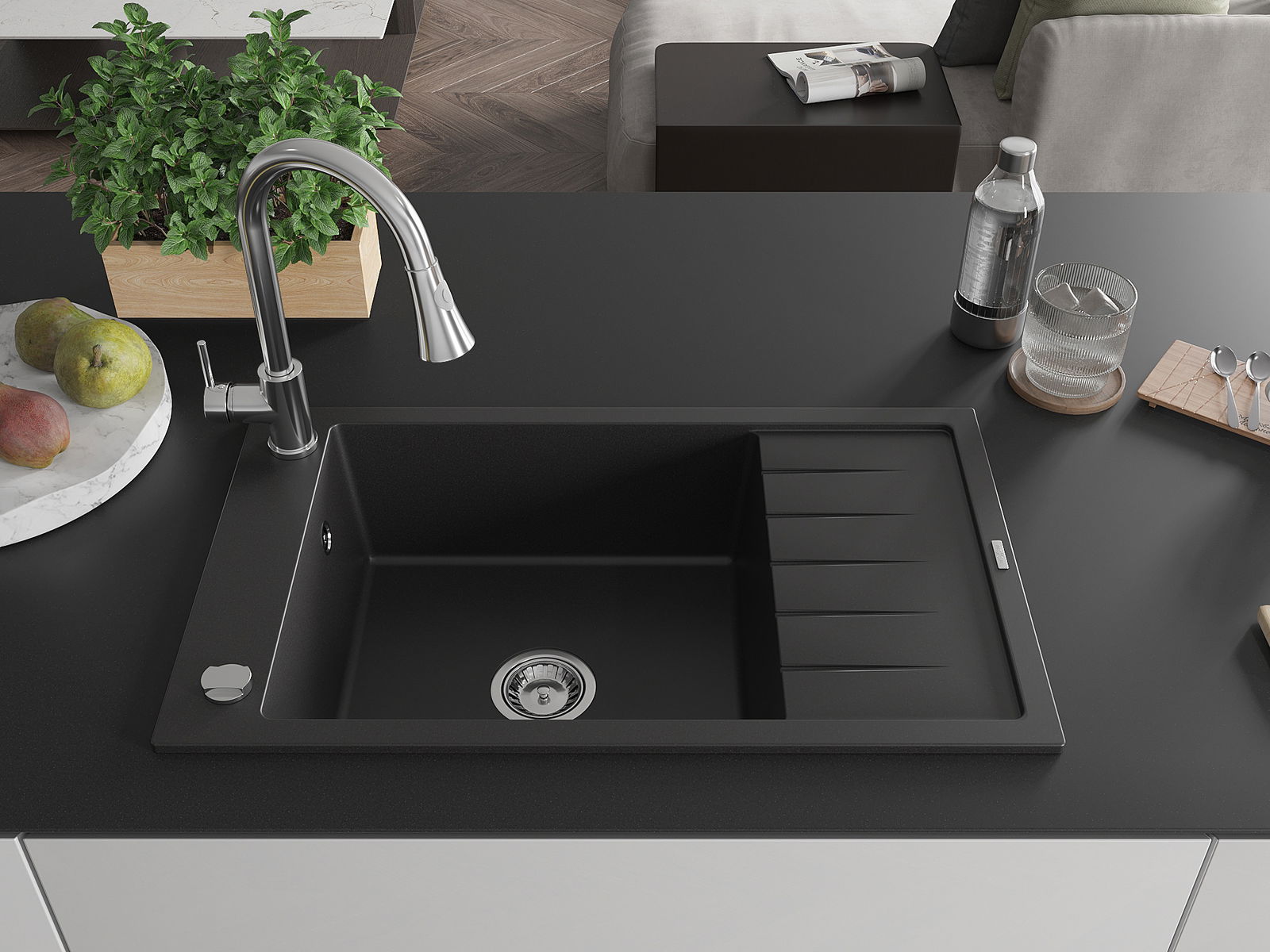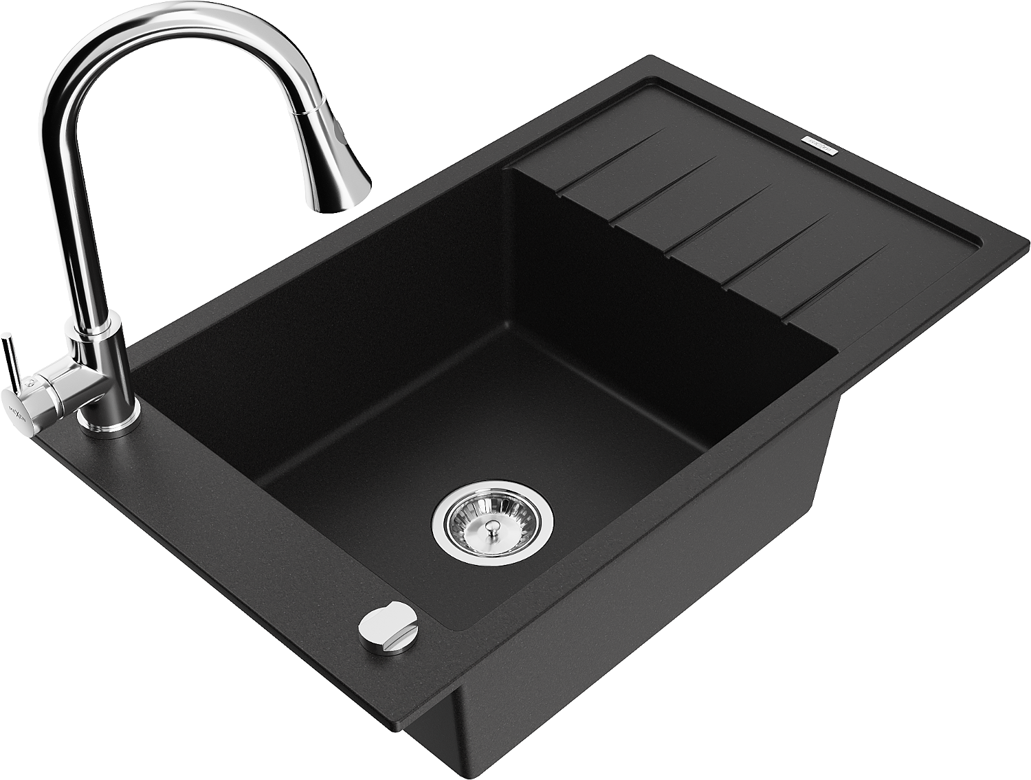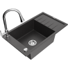 Mexen Elias évier en granit 1 bac avec égouttoir et robinet de cuisine Elia, noir - 6511-77-670101-00