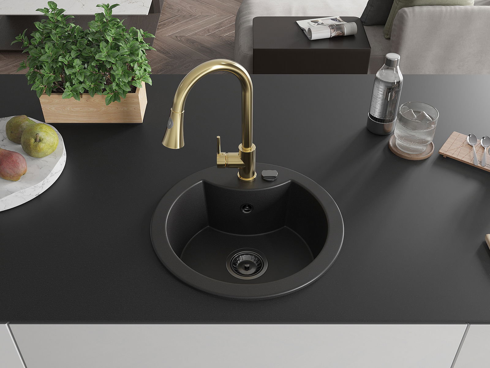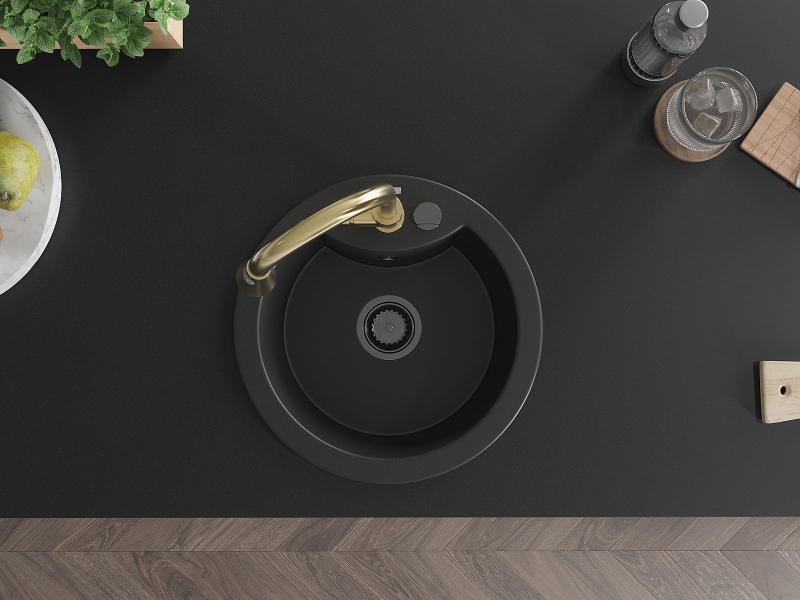 L'évier a un trou sous-meulé de 35 mm de diamètre à percer soi-même. Il peut être utilisé, entre autres, pour installer un distributeur de liquide, ce qui éliminera la présence de bouteilles en plastique dans la cuisine et lui donnera une finition élégante.