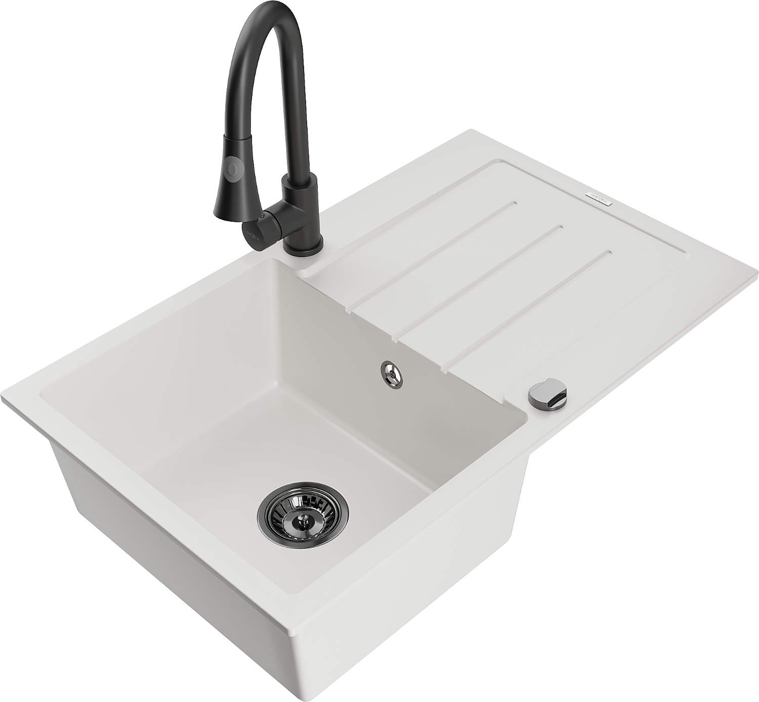 Mexen Bruno évier de cuisine en granit à 1 bac avec égouttoir et robinet de cuisine Elia, blanc - 6513-20-670101-70
