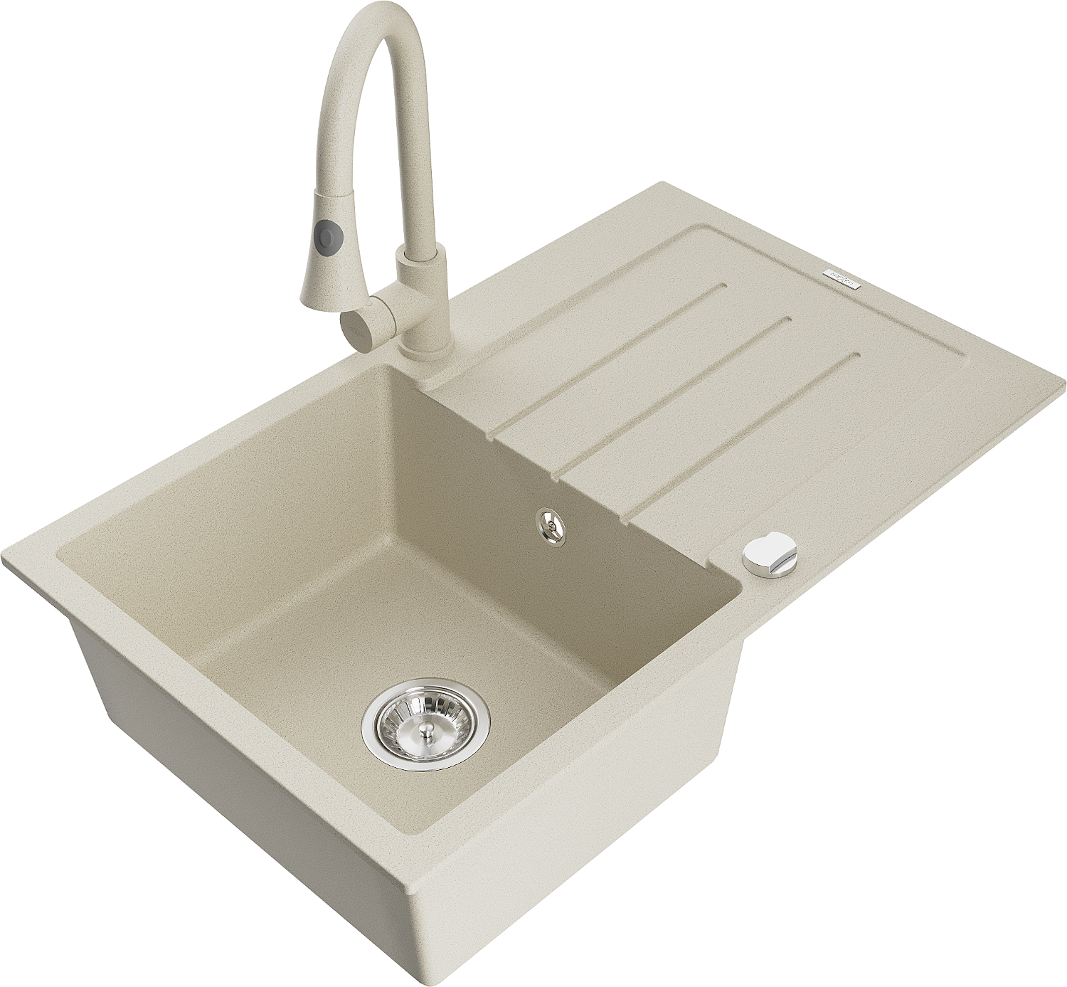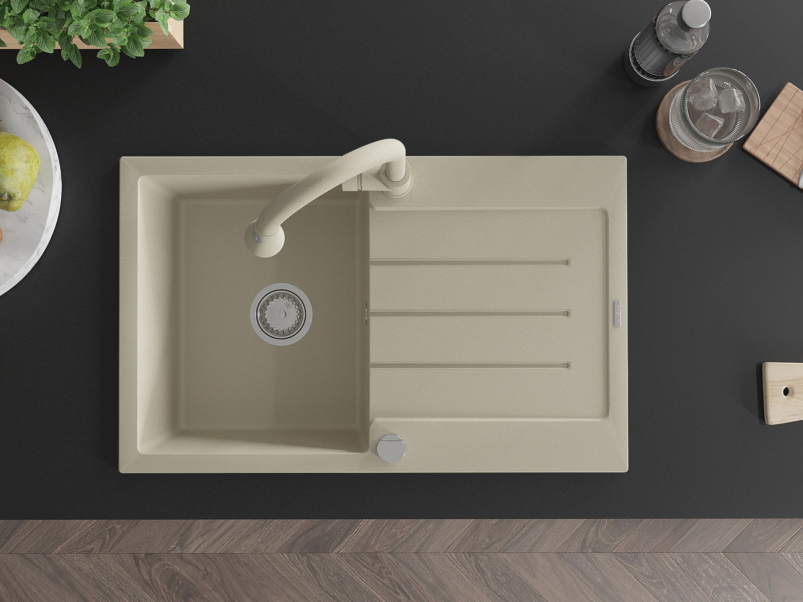 Mexen Bruno évier en granit 1 bac avec égouttoir et robinet de cuisine Elia, beige - 6513-69-670101-69