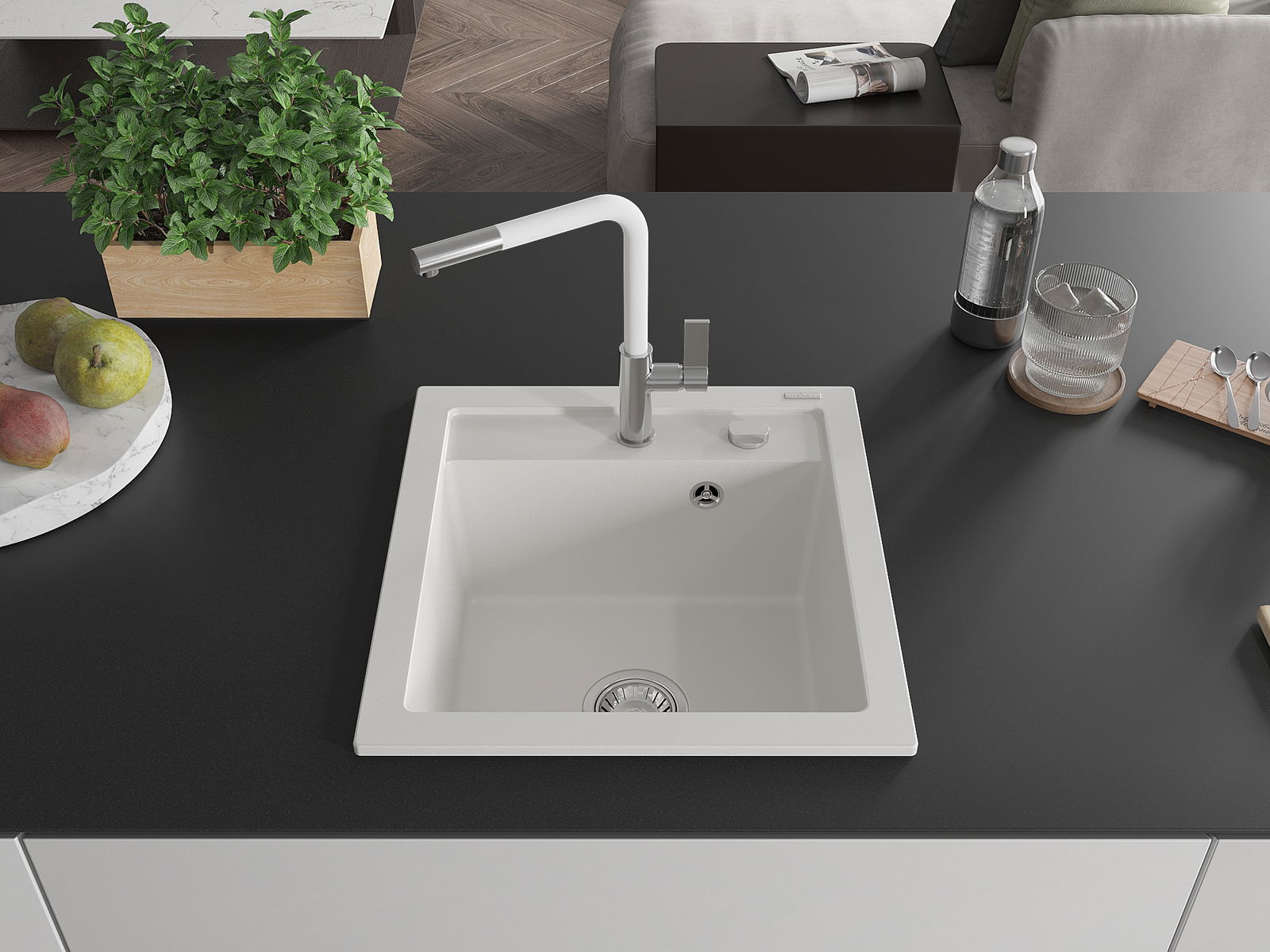 L'évier a un trou sous-meulé de 35 mm de diamètre à percer soi-même. Il peut être utilisé, entre autres, pour installer un distributeur de liquide, ce qui éliminera la présence de bouteilles en plastique dans la cuisine et lui donnera une finition élégante.