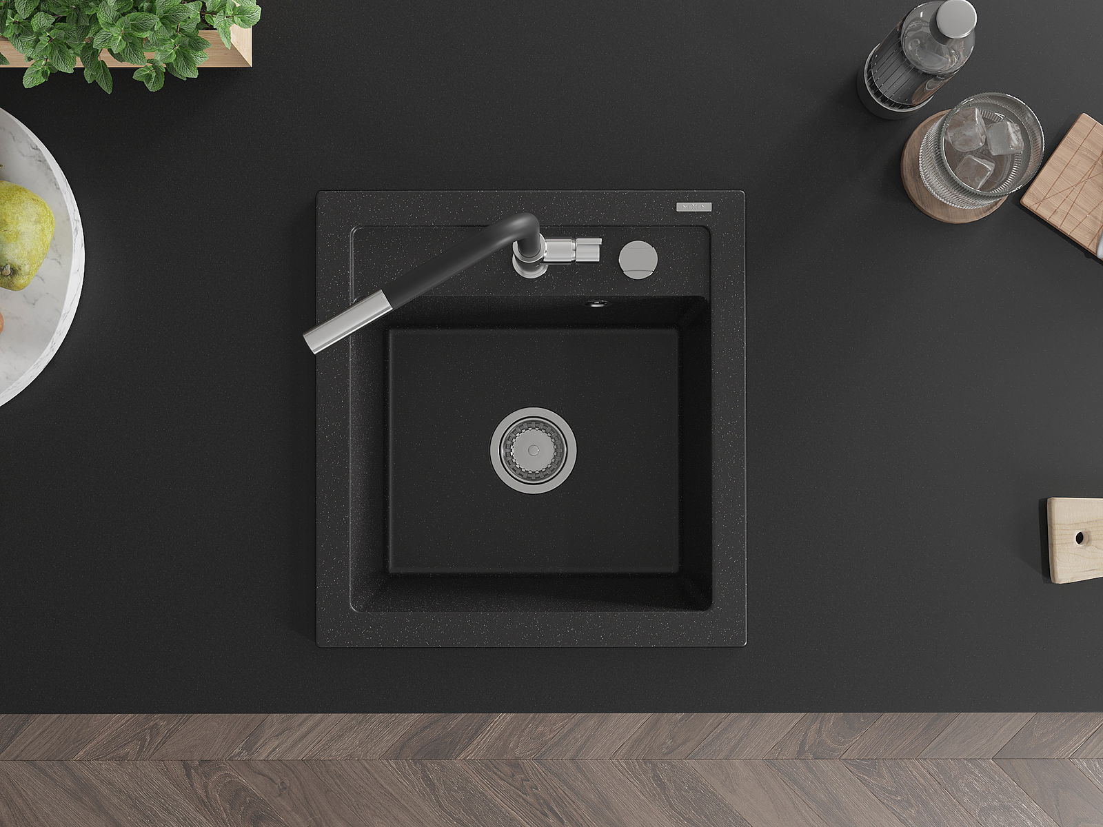 Mexen Vito évier en granit 1 bol avec robinet de cuisine Flora, noir / métal argenté - 6503-73-670401-07