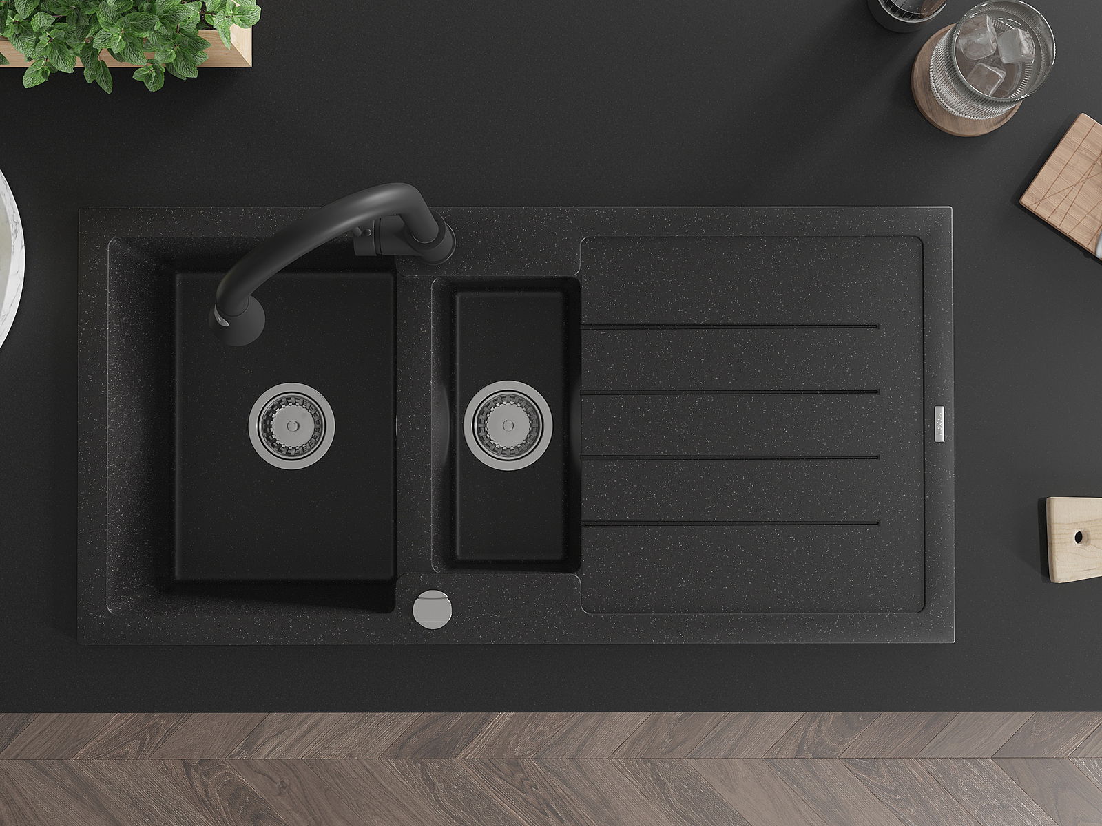 Mexen Andres évier en granit 1,5 bac avec égouttoir et robinet de cuisine Elia, noir/argent métallisé - 6515-73-670101-70