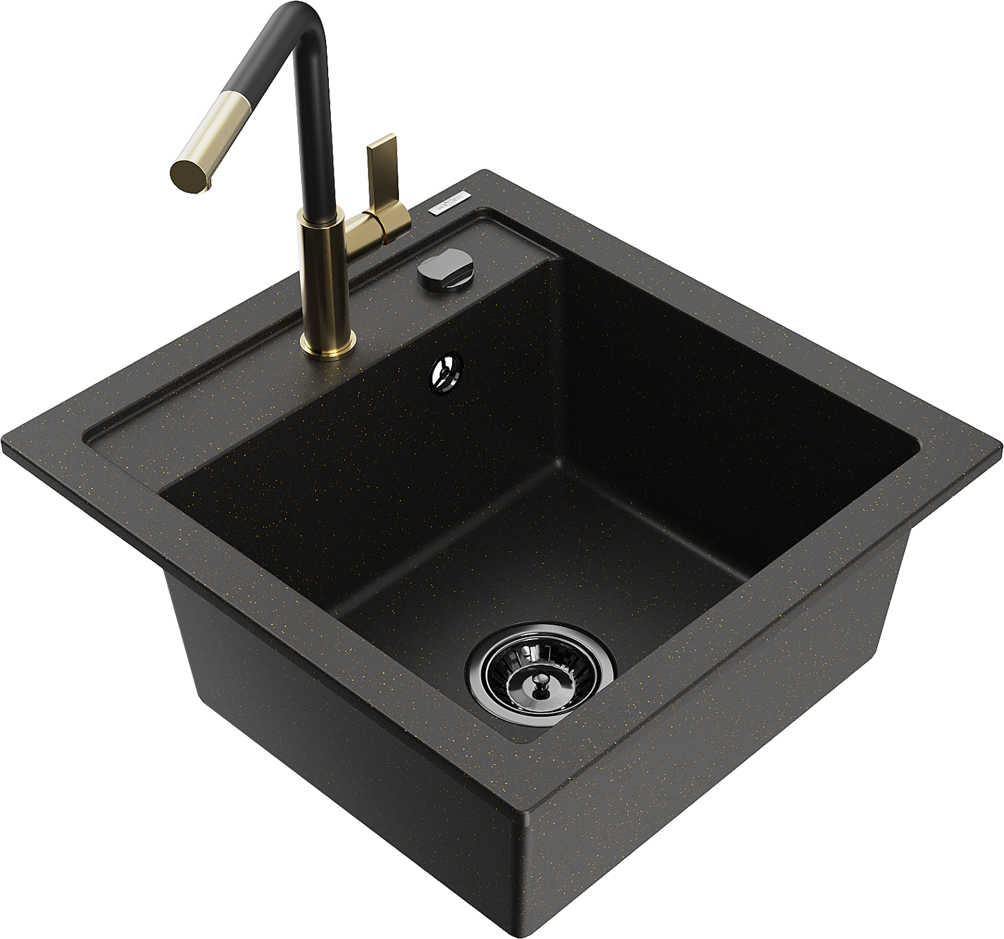 Mexen Vito évier en granit 1 bac avec robinet de cuisine Flora, noir/or métallisé - 6503-75-670401-57-B