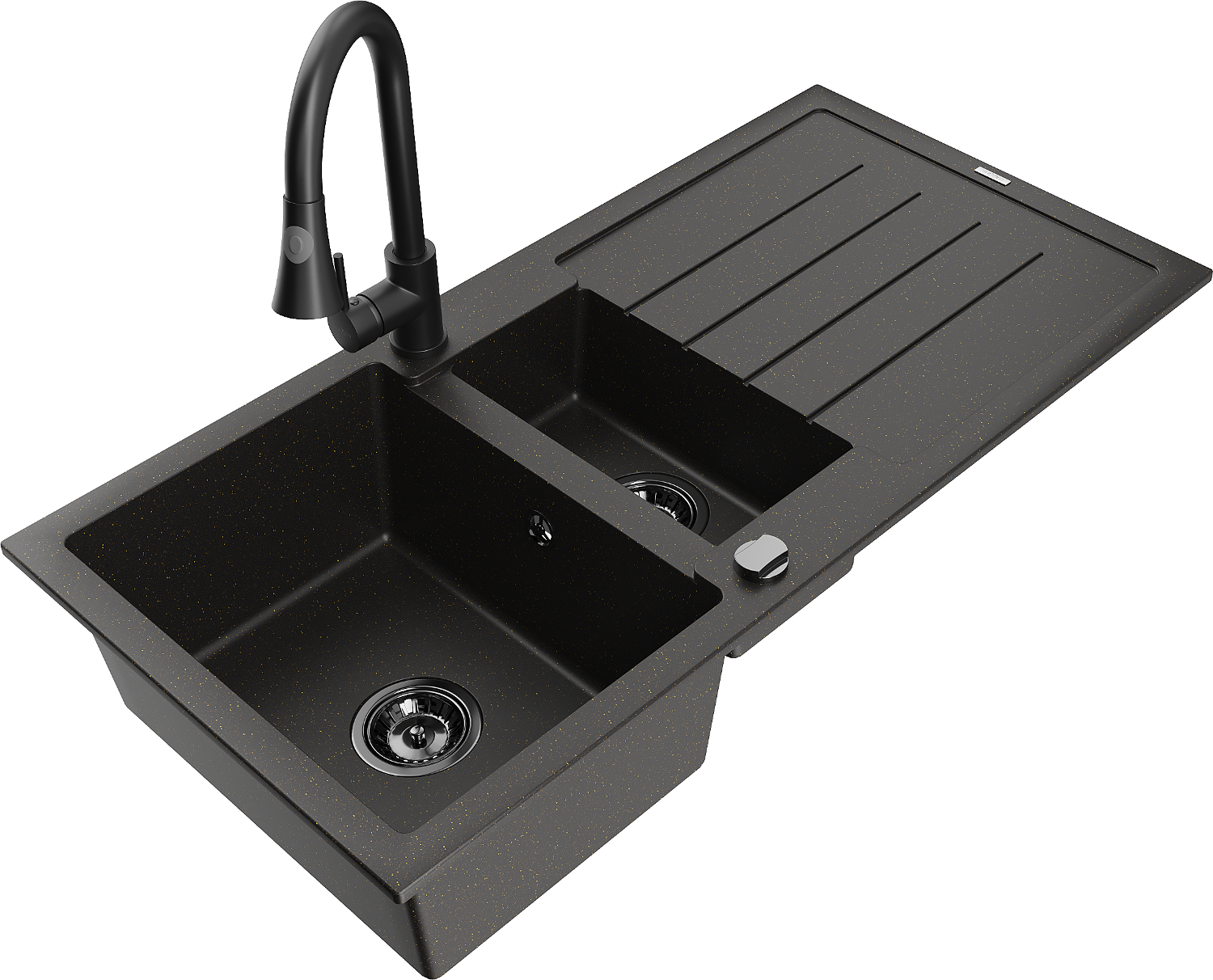 Mexen Andres évier en granit 1,5 bac avec égouttoir et robinet de cuisine Elia, noir/métallique doré - 6515-75-670101-70-B