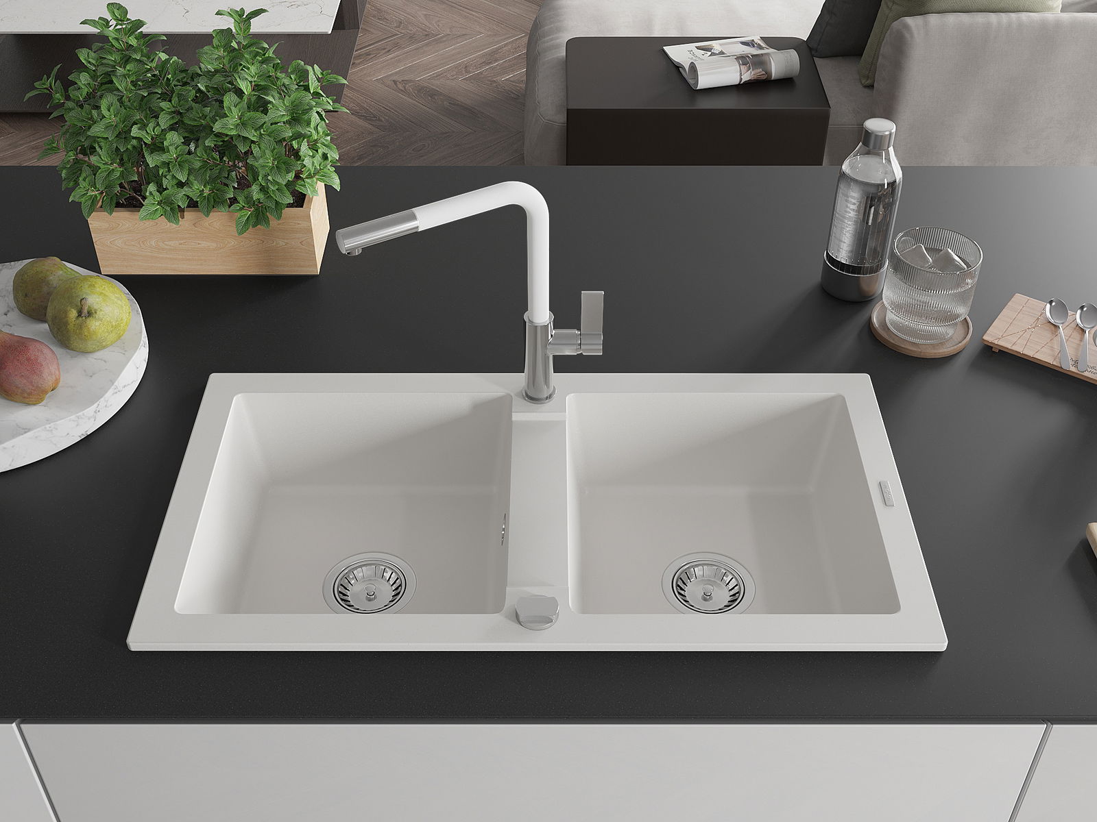 Mexen Mario évier en granit à 2 bacs avec robinet de cuisine Flora, blanc - 6504-20-670401-02