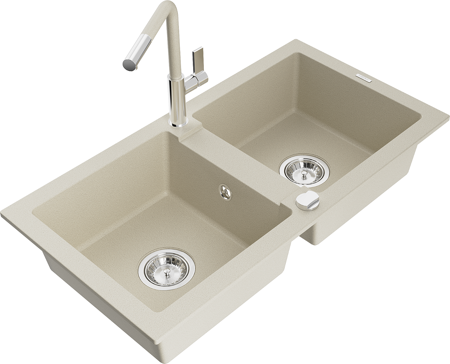 Mexen Mario évier en granit à deux bacs avec robinet de cuisine Flora, beige - 6504-69-670401-09